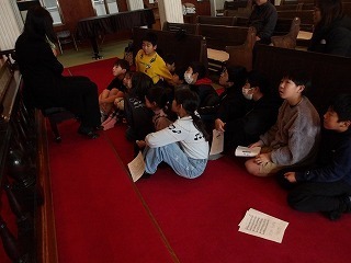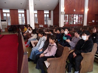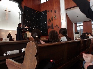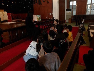 白川教会に隣接している幼稚園の園長先生に演奏していただき、一緒に讃美歌を歌い、絵本を読んでいただきました。