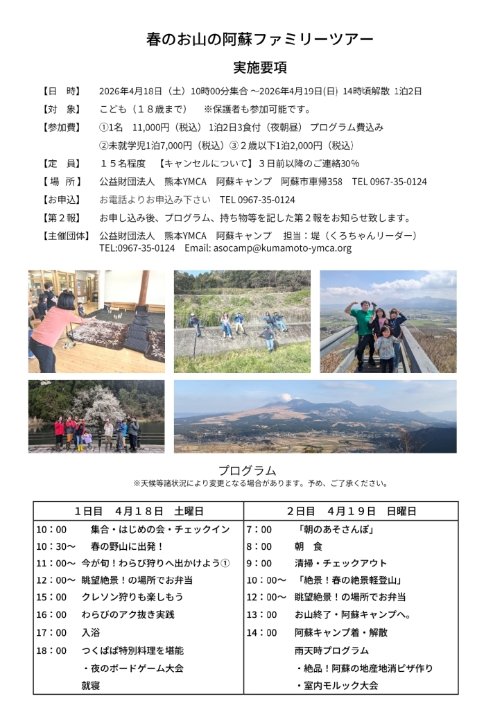 | 2日目(4/19) | 朝のあそさんぽ、朝食、春の絶景軽登山、昼食、14:00頃解散 |