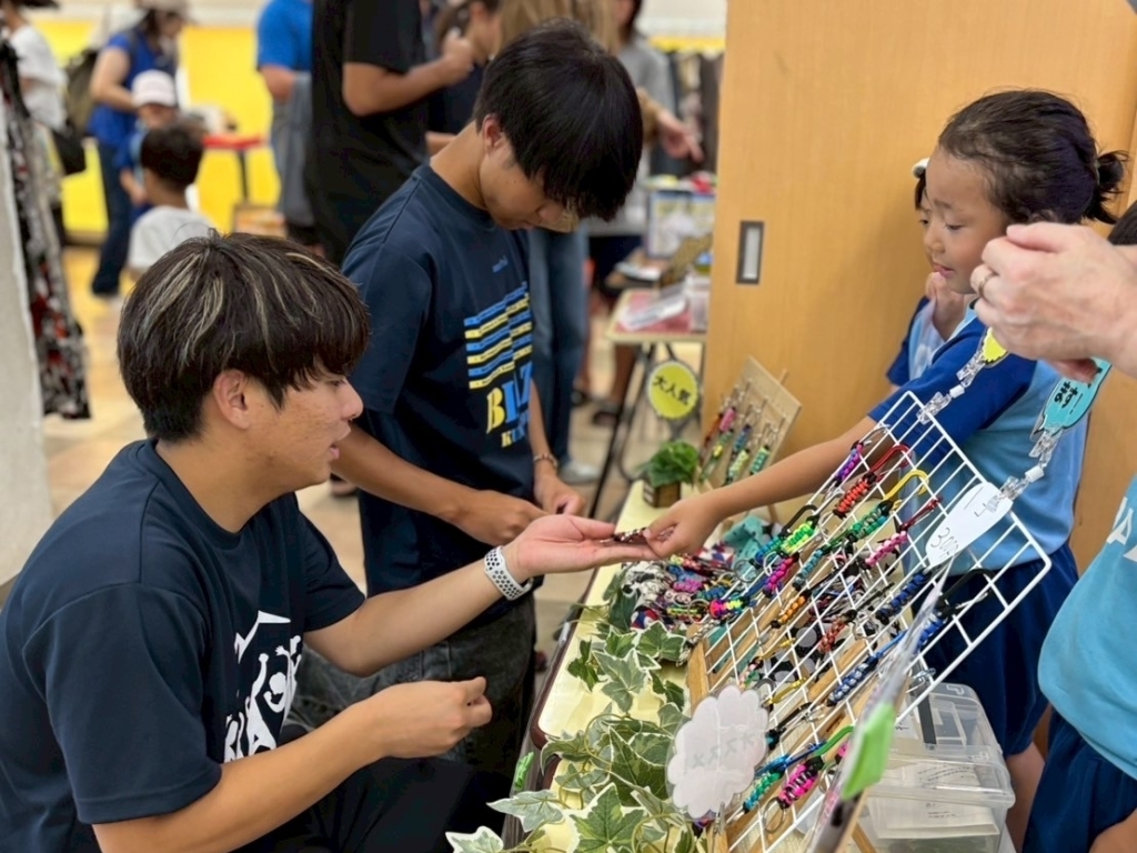 ぶどうの木はのみの市とパラコードキーホルダーの担当です。のみの市は寄贈いただいたものを販売します。パラコードキーホルダーは保護者や子どもたちの手作りのものを販売します。ワークショップのコーナーも設けられ大盛況です‼