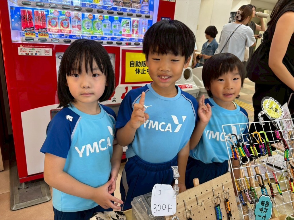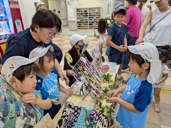 4歳児、5歳児のお友だちは販売のお手伝いです。「いらっしゃいませ」「パラコードキーホルダーいかがですか」と大きな声で呼びかけます。