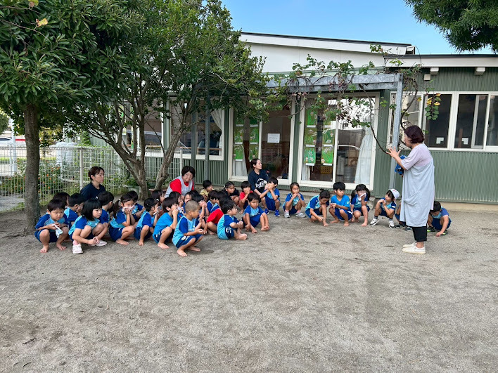 2025年9月25日(金)本日は避難訓練を実施しています。地震がおき、まずは室内で安全確保。その後火事になり屋外へ避難をしました。子どもたちは真剣そのもの。地震の時は、安全のため靴を履いてん避難するはずが、素足で跳び出した子も多かったようです。