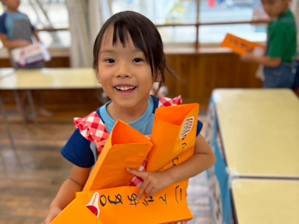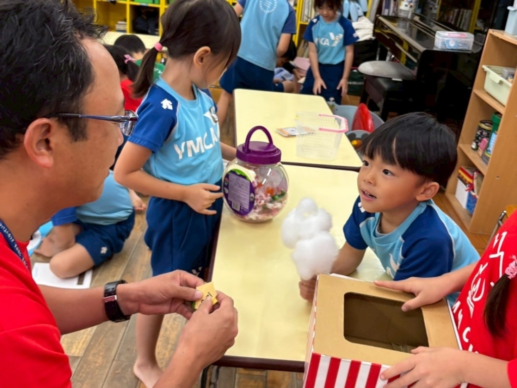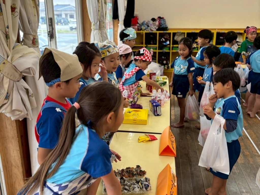 店員役の年長さんも、商品の渡し方や声のかけ方など、自分たちなりに工夫して楽しんでいました。