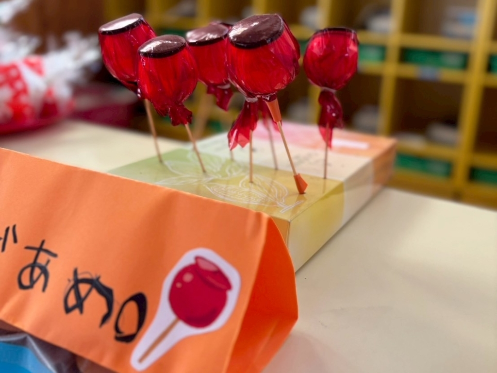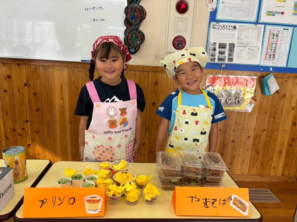 会場には、りんご飴やポップコーン、わたがしなど、子どもたちがアイデアを出し合って作った さまざまなお店 が並びました。どのお店も手作りの看板があり、とてもにぎやかな雰囲気です。