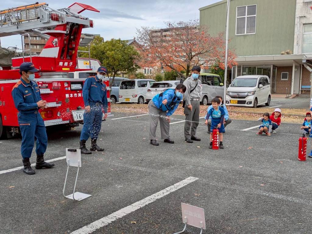 消防署の方による消火器の使い方についてお話を聞き、年長児クラスのお友だちと先生たちがチャレンジしました。