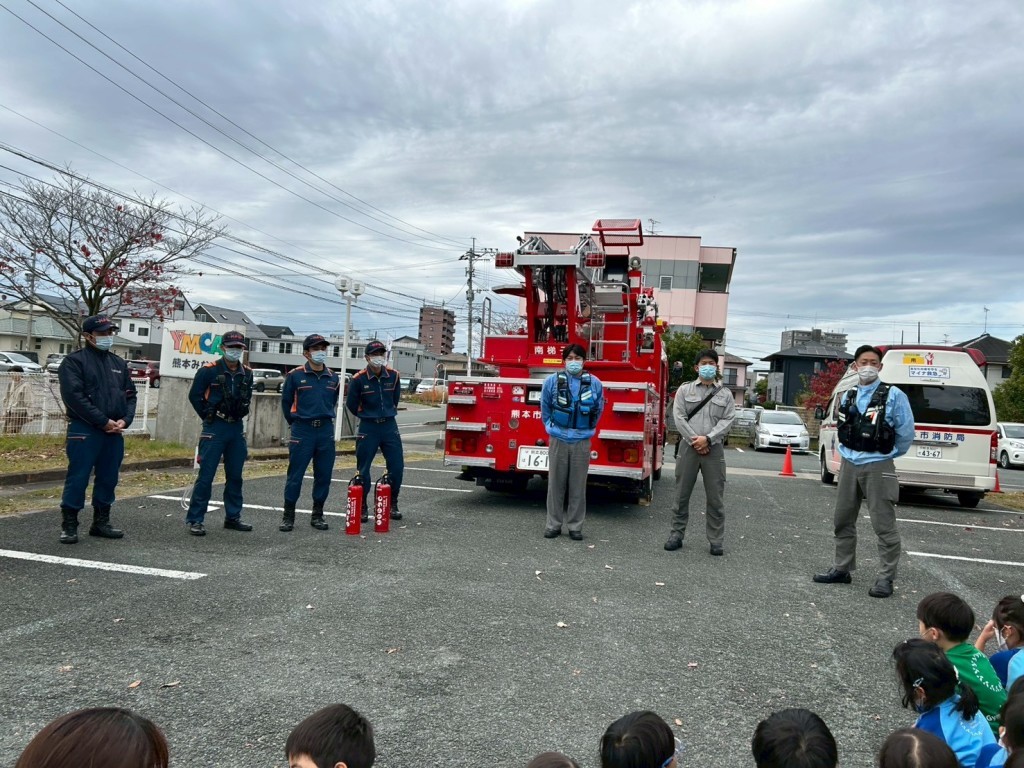 「火事になったよ」という声を聞き、先生と一緒に外へ速やかに避難します。煙を吸わないよう「ハンカチでお口をおさえるよ!」という約束もしっかり守り、とても頼もしかったです。