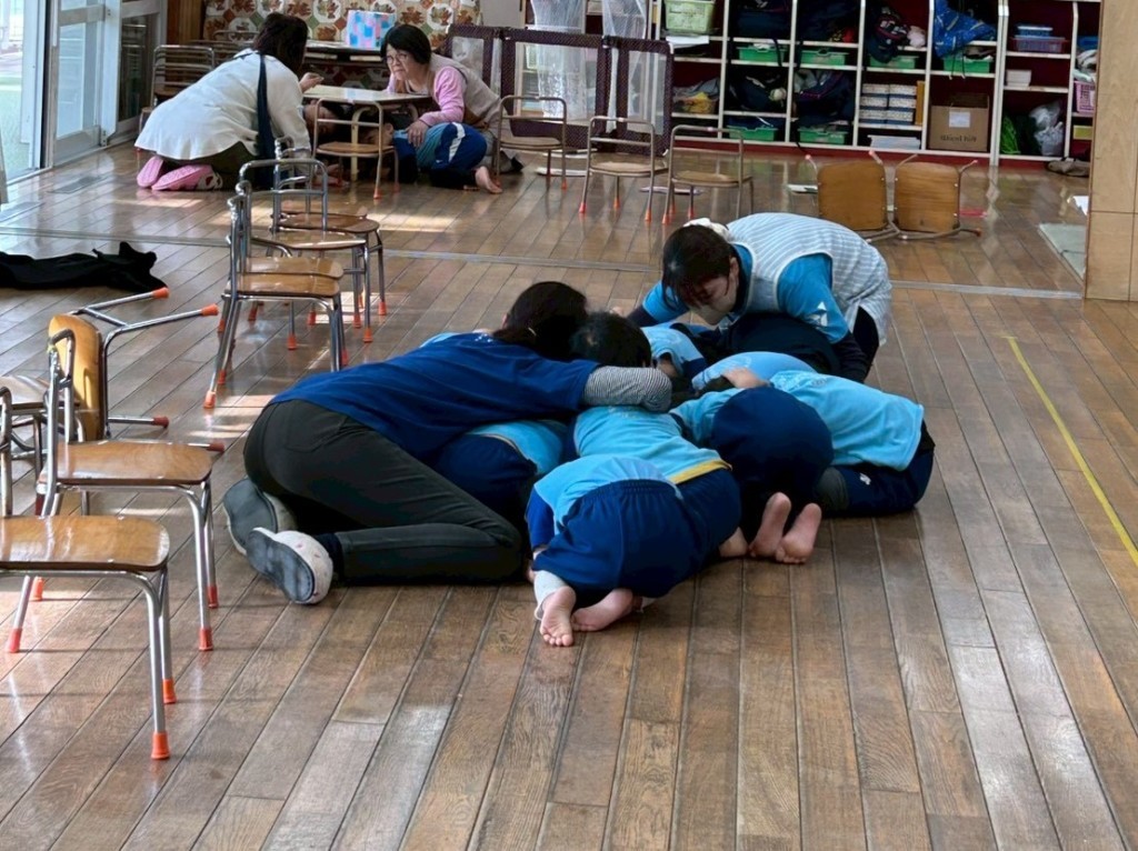 朝の活動中に「地震だよー」「揺れてる揺れてる」という先生の声を聞き、子どもたちは机の下に隠れたり、部屋の真ん中にダンゴムシのポーズをとって避難しました。