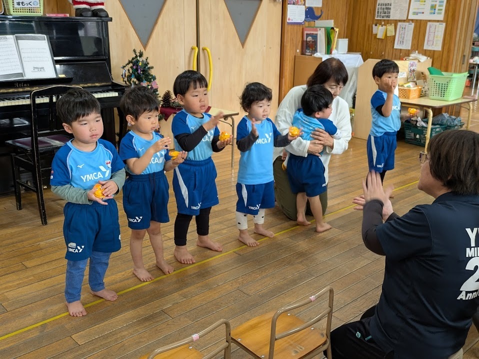 4歳児こぐまクラス『ジングルベル』を鈴で演奏♪「ヘイ!」と元気に声を合わせ、かっこよく決めてくれました!