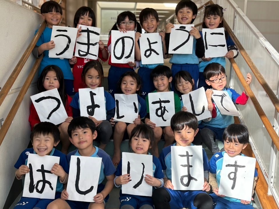 年長児は、来年の抱負「馬のように強い足で走ります」と一人一文字ずつ書きました。一人ずつの表現がつながっていきます。個性のある力強い文字に、読んでいるこちらも元気になりますね。