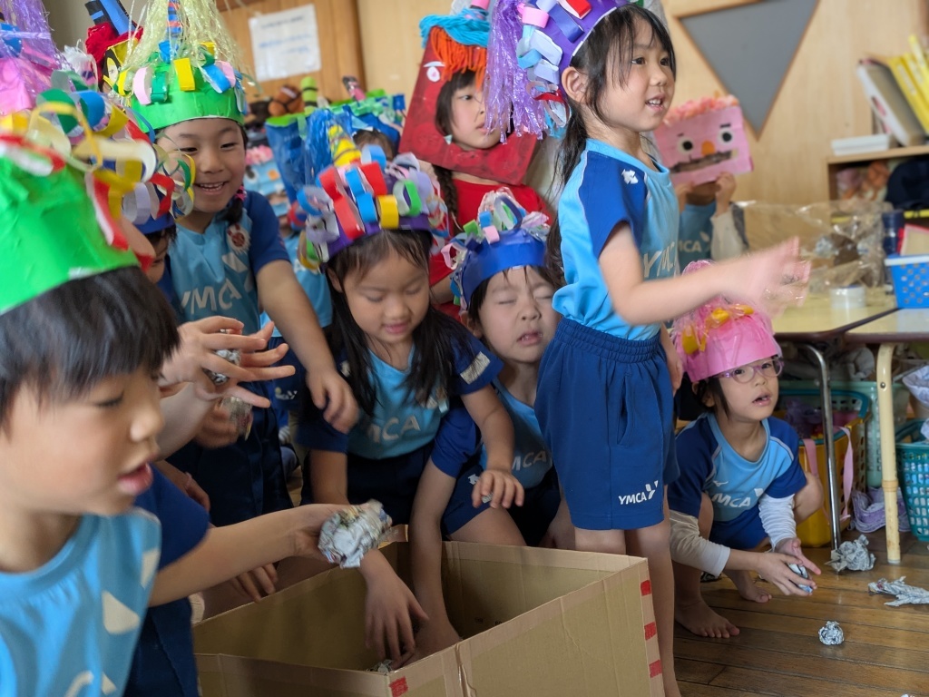 子どもたちは新聞紙で作った豆を手に、「おにはそと!」と一生懸命投げて応戦しました。