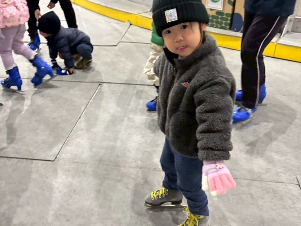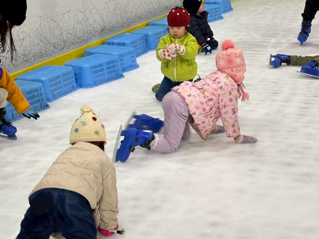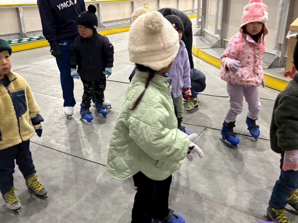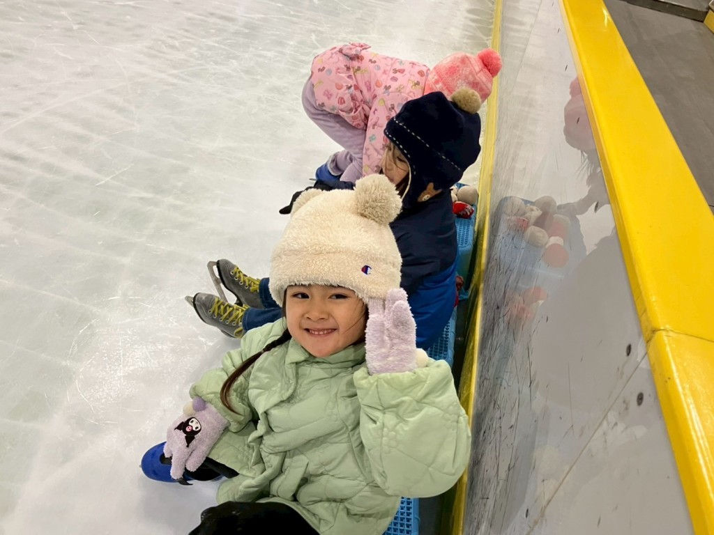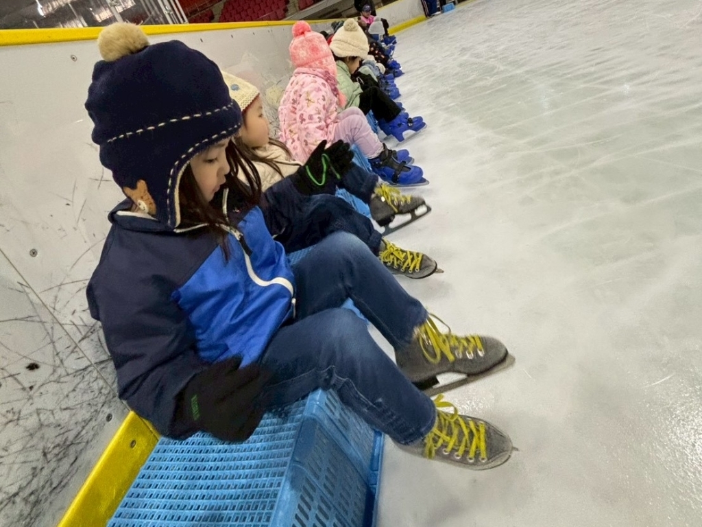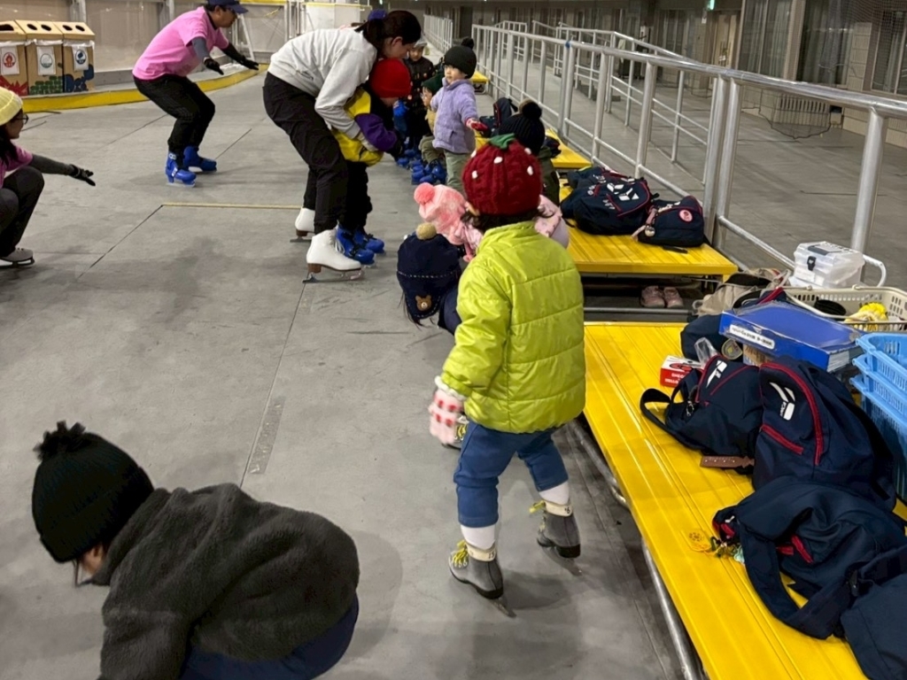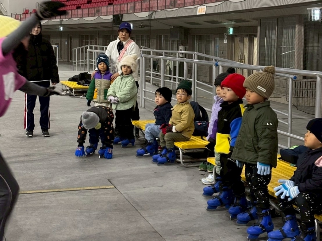 今日は、スケートプログラムの1回目。2歳児~5歳児までチャレンジしましたが、今回は2,3歳児クラスの様子をお届けします。