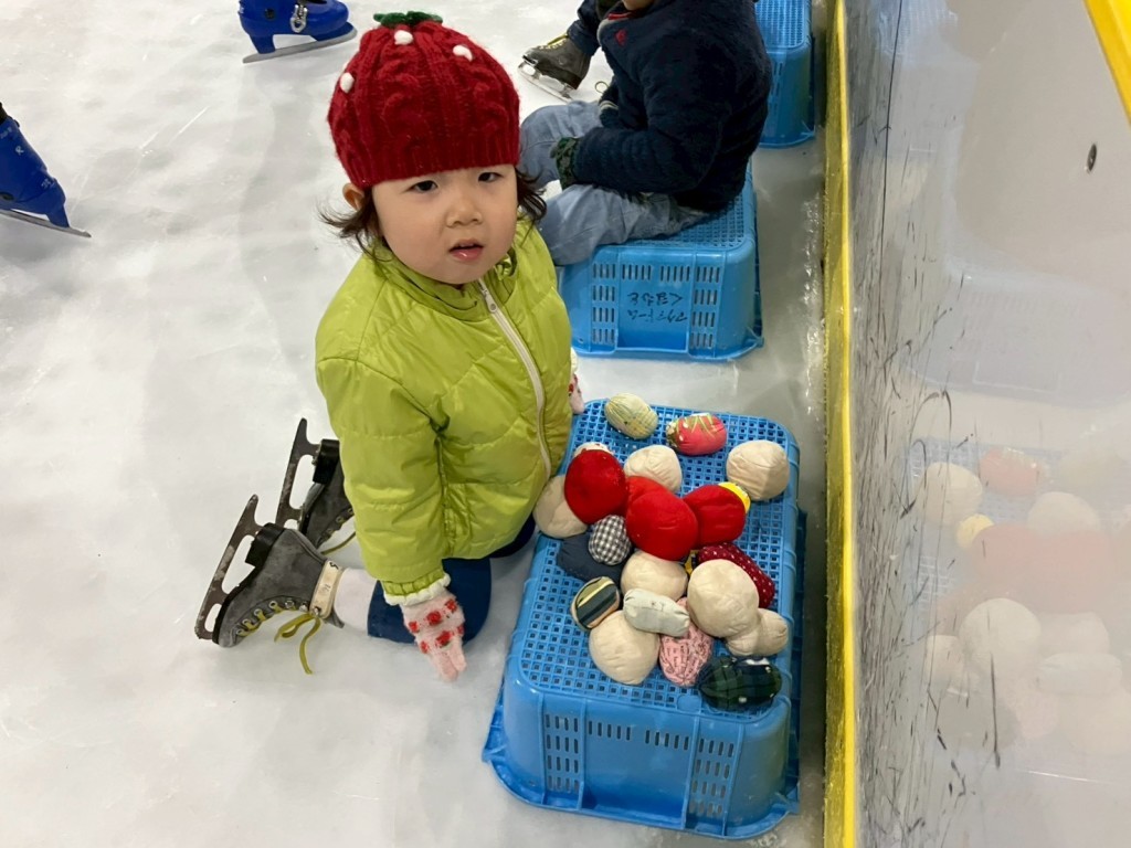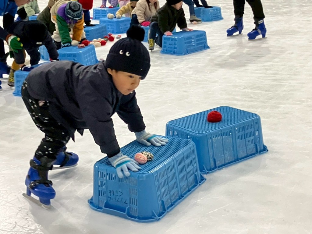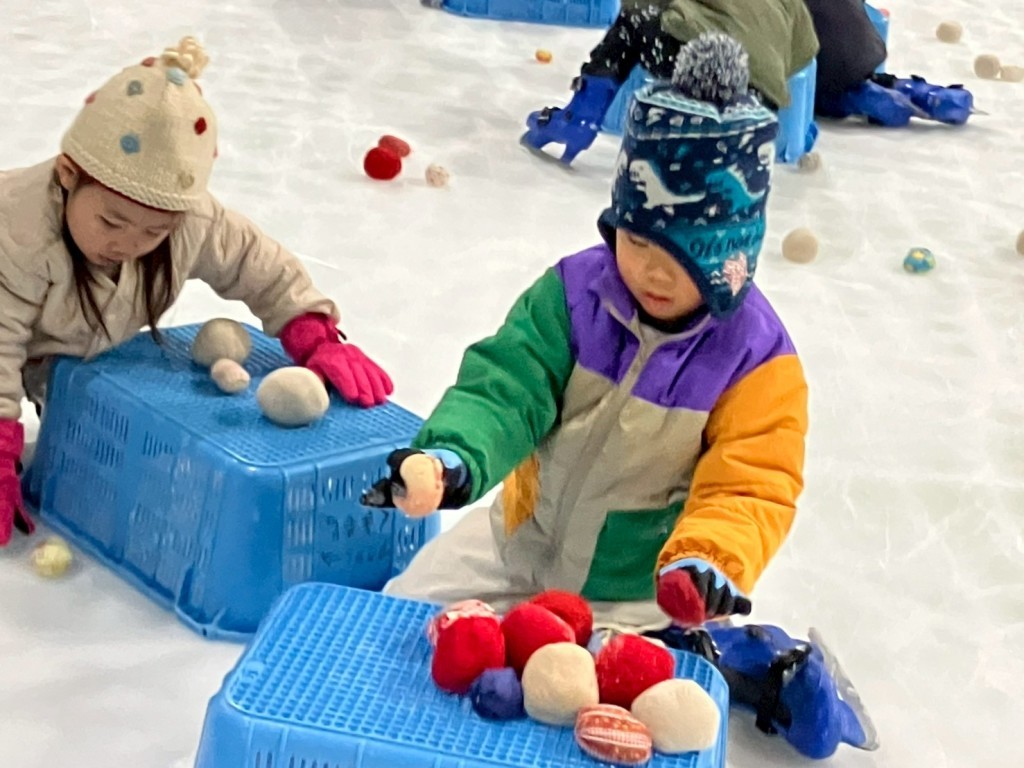 氷の上では「犬さん」になって動いてみたり、かごを押して進んでみたりと、楽しみながら氷の感触を体験しました。お手玉拾いにも挑戦し、少しずつ氷の上での活動に慣れていきました。
