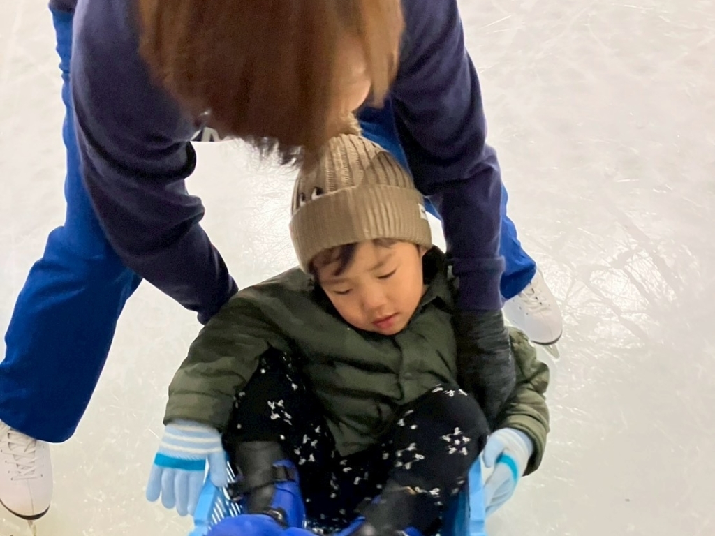 はじめはかごに乗って、先生やリーダーに押してもらいドキドキしながらリンクイン。
