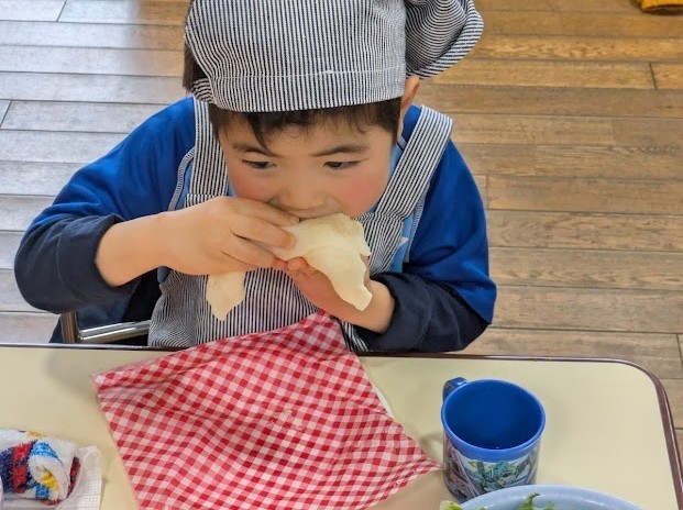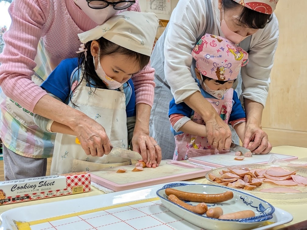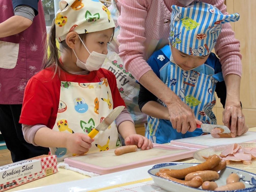 小麦粉を混ぜたり、先生と一緒にハムやウインナーを切ったり、具材を包んだりと、どの工程も楽しそう。