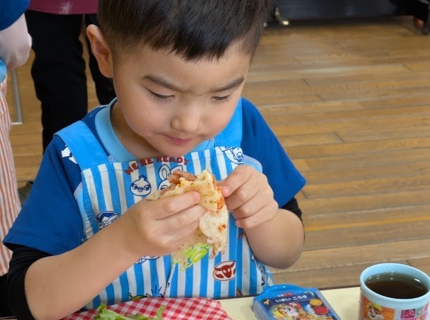自分たちで作ったガレットは、いつも以上においしく感じたようで、普段は苦手なトマトやレタスにも、思いきってチャレンジする子どもたちの姿が見られました。