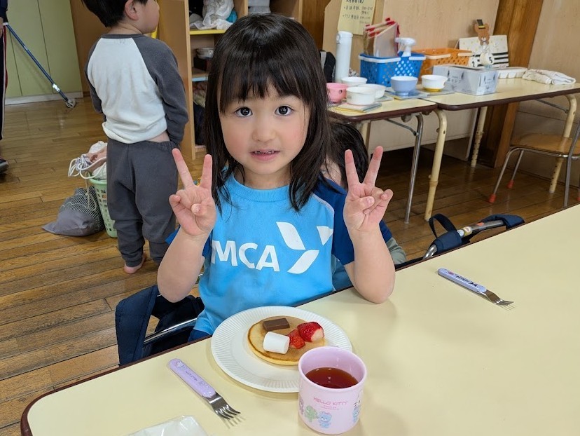 おやつの時間には、ふんわり焼けたパンケーキにチョコやマシュマロ、いちごをのせて登場し、「うわー!」」と嬉しそうな声があがっていました。