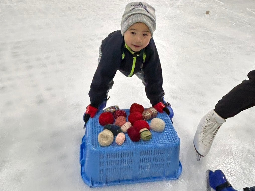 前回よりもかご押しがとても上手になったため、かご押し鬼ごっこやお手玉拾いゲームなどでしっかりと体を温めると、氷上での歩行にどんどんチャレンジ。すると氷の上でも自分の力でしっかり歩ける姿がたくさん見られるようになりました。吸収が早いです!