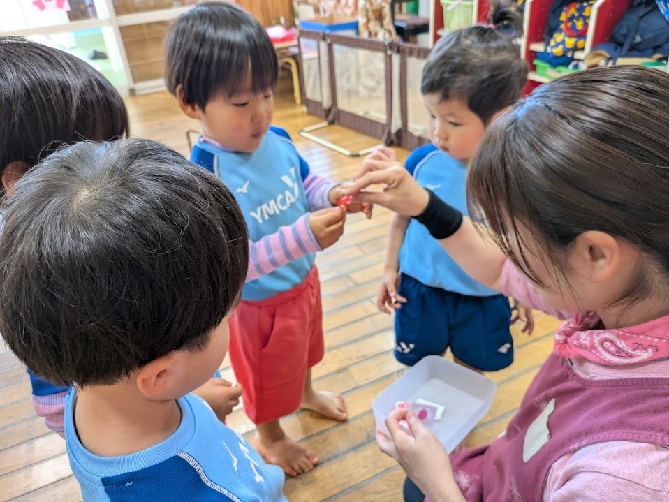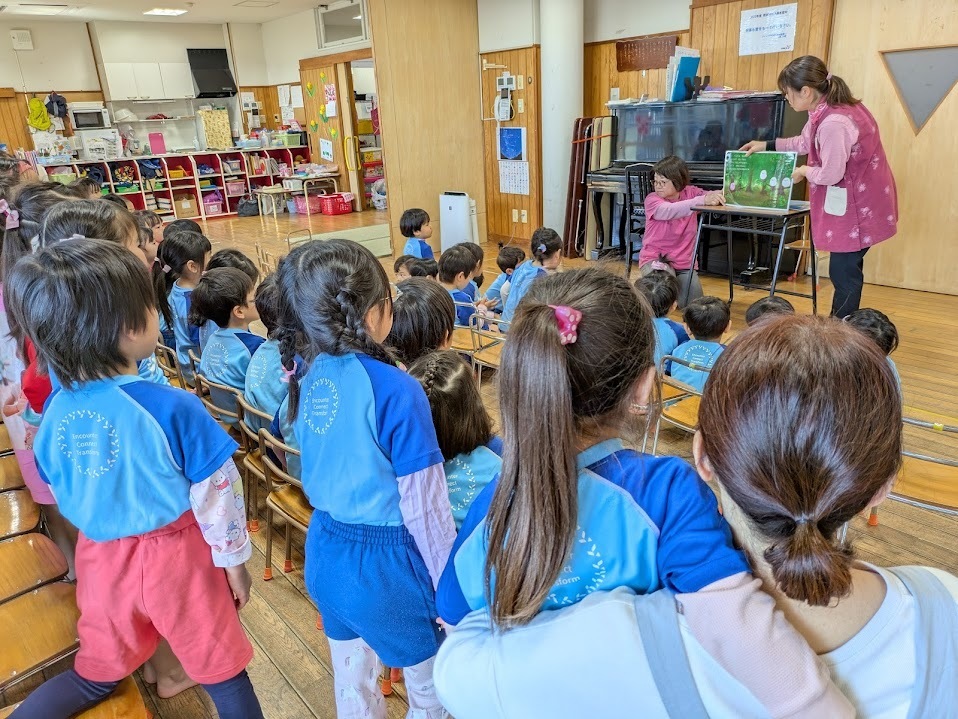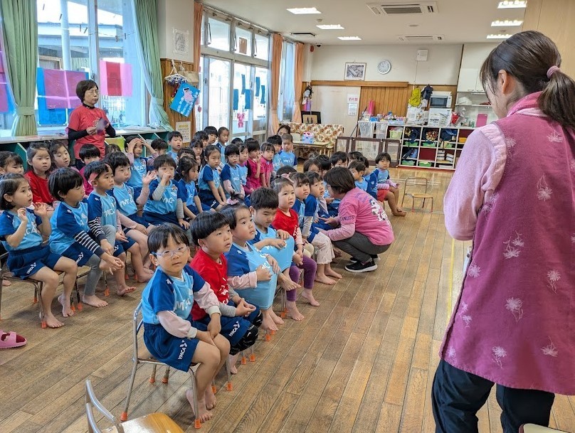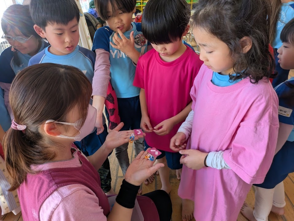 お話は、そのはじまりのエピソードからスタートしました。いじめを受けた男の子のために、周りの生徒たちがピンク色のシャツを着て登校したことがきっかけとなり、思いやりの輪が世界へと広がっていったことを知りました。また、『ベリベのいろ ぼくのいろ』の絵本を通して、ありのままの自分を受け入れてもらうことの大切さに触れました。さらに、社会で問題となっている「いじめ」についても、子どもたちにわかりやすく伝えました。まだ幼い子どもたちにとっては、すぐには実感しにくい内容もあるかもしれません。しかし、一人ひとりが違うことを知り、お友だちのさまざまな考えや姿を受け入れながら過ごしていくことの大切さを、これからも丁寧に伝えていきたいと思います。
