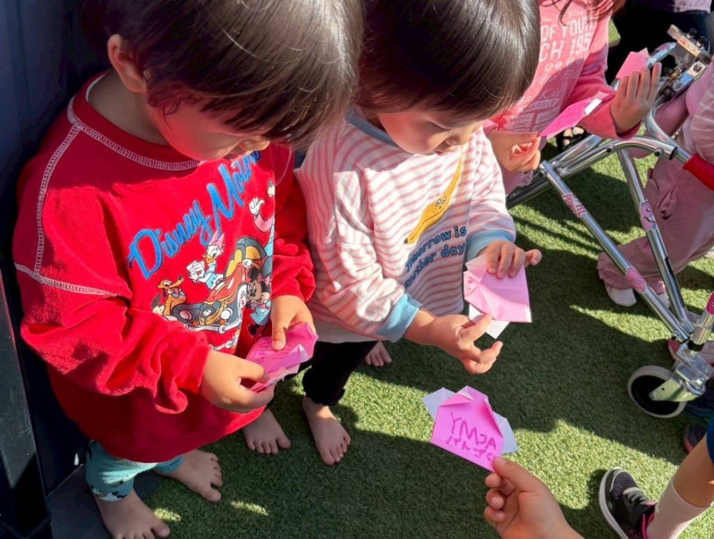 子どもたちは、一人ひとりに折り紙で作ったピンクシャツを手渡しでプレゼントしました。