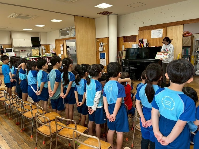 新しいクラスやお部屋での生活が始まったばかりでしたが、子どもたちは先生の話をよく聞き、落ち着いて避難することができました。初めて参加するお友だちも、周りの様子を見ながら一生懸命に行動する姿が見られました。また、年中・年長児はハンカチで口元を押さえ、煙を吸わないようにしながら避難することも忘れずに行うことができました。