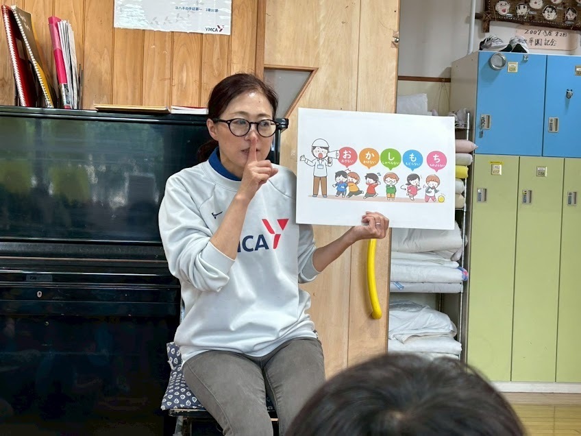 事前に絵本「かじどうするの?」を読み、火事のときにどのように行動するのかを子どもたちと一緒に考えました。また、避難するときの大切なお約束である「おかしもち(おさない・かけない・しゃべらない・もどらない・ちかづかない)」についても確認してから訓練に臨みました。