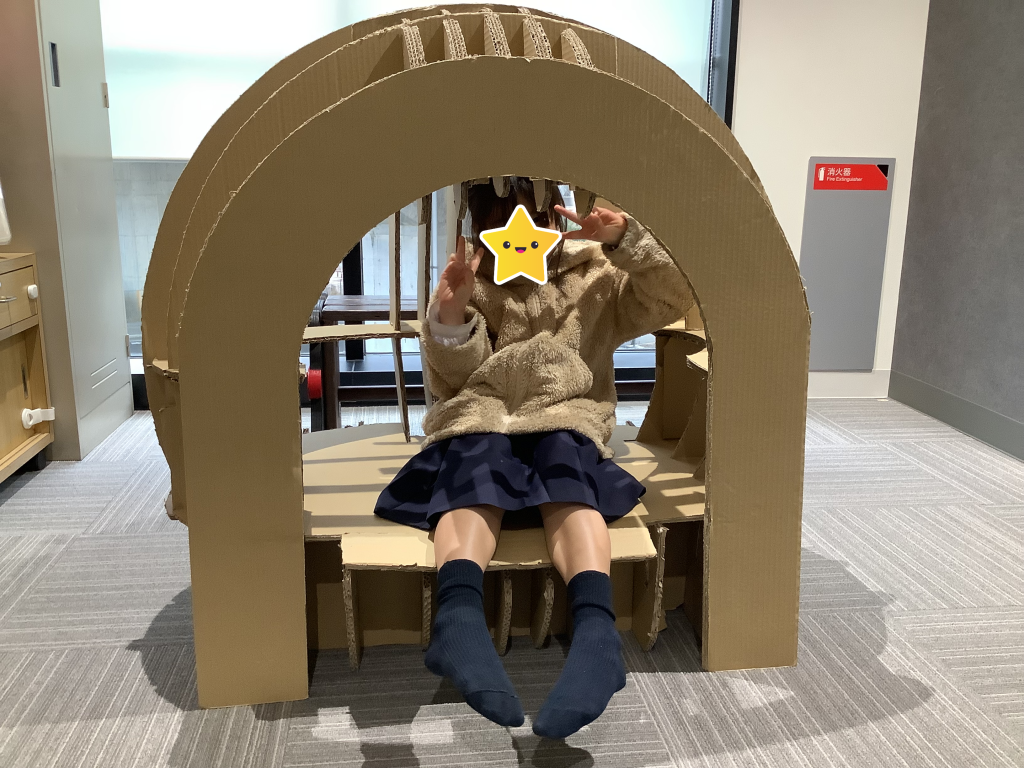 そして、YMCA学院の建築科の学生さんから卒業制作の段ボール椅子を自由なイルカたちに頂きました。ありがとうございました。イルカのメンバーみんなは大喜びで、毎日使っています。