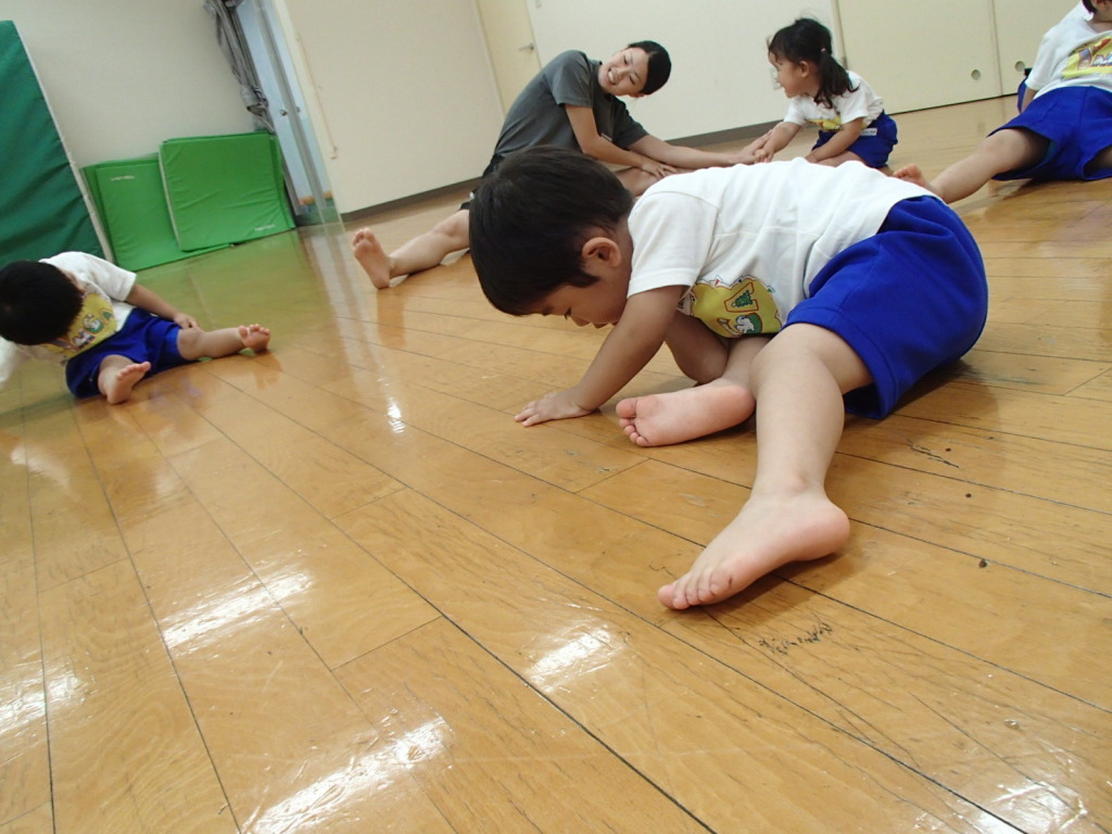 2017年7月3日(月)今日も元気に登園してくれました。お休みもなく、全員出席です♪サーキットは、新しくトンネルを入れました。みんなでくぐって楽しそう。 前回りも一人でできるようになってきましたよ♫ そして、今日はみんなでマットの上に座り、…