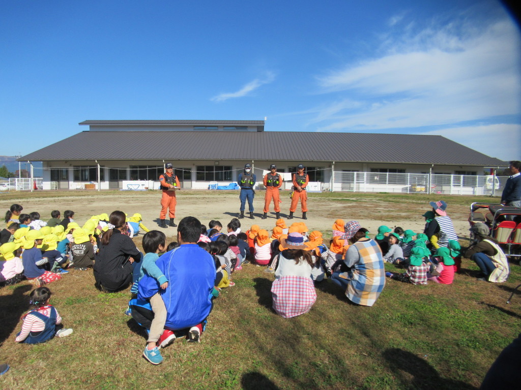 今日は、阿蘇広域消防署の皆さんのご協力をいただき、消防避難訓練を行いました。火災発生から初期消火、避難誘導、傷病者対応の一連の流れを確認することができました。次に消火器を使った消火訓練を行い先生方が消火器の扱い方を確認しました。その後は緊急車両をみせていただき、車両の大きさにびっくりしたり、いろんな道具が積んであることに驚いていました。これから寒くなり火を使うことも多くなるのでみんな注意していこうね!