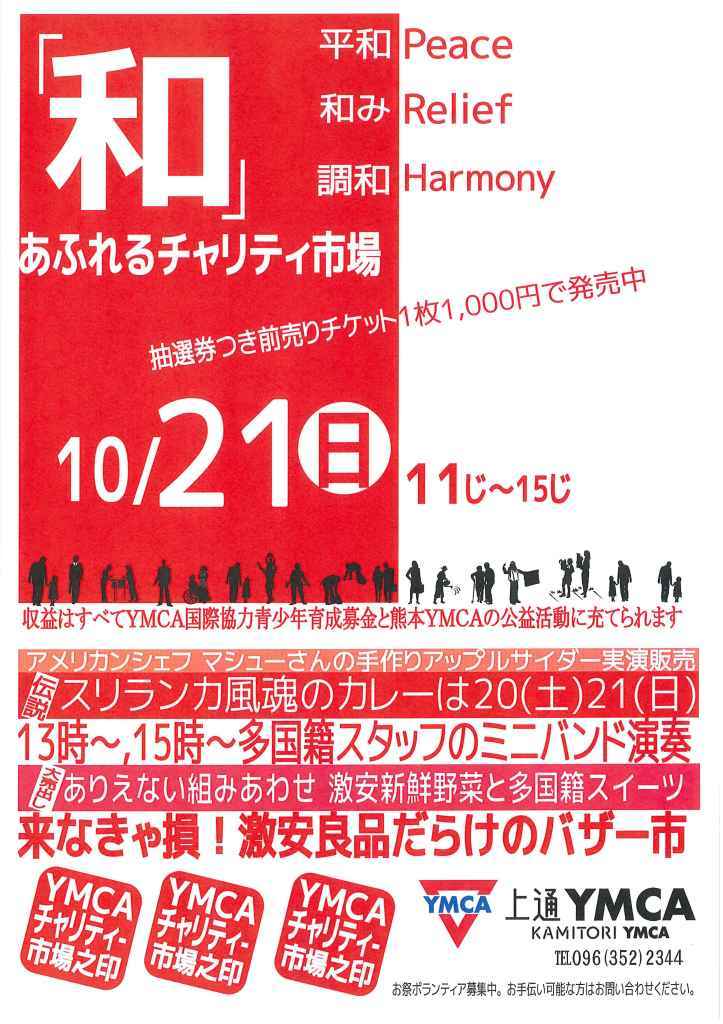 YMCAチャリティのための「上通YMCAチャリティ市場」今年もやります!掘り出しもんあり!世界のスイーツあり!スリランカ風魂のカレーあり!多国籍ミニバンド演奏あり!豪華商品があたる抽選券付き1,000円分チケット販売中! 上通YMCA〒86…