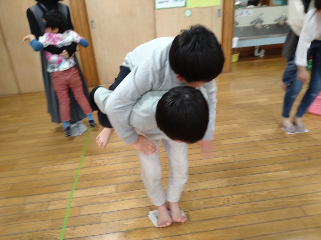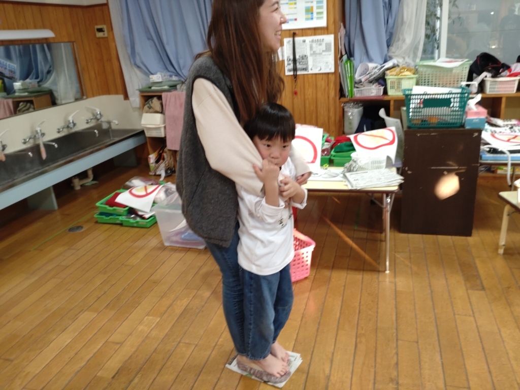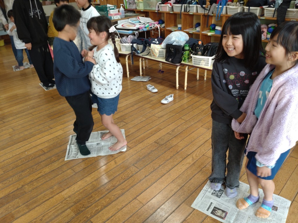 音楽が止まる度に、新聞紙を折り曲げます。ペアで落ちないようにkeep dancing♪