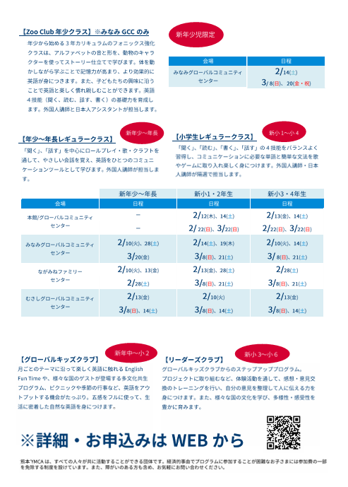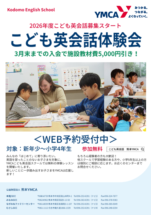 YMCAこども英会話では、2026年度受講生を募集します。英語を習ったことのないお子さまを対象に、無料の体験レッスンを開催しております。