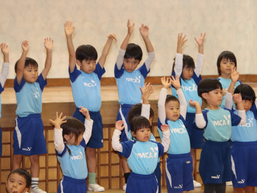 幼稚園の子どもたちは、毎日取り組んでいる体操「おひさまパワー」、歌「せかいじゅうのこどもたちが」、そしてダンス「くまモンタッチ」を元気いっぱいに披露しました。