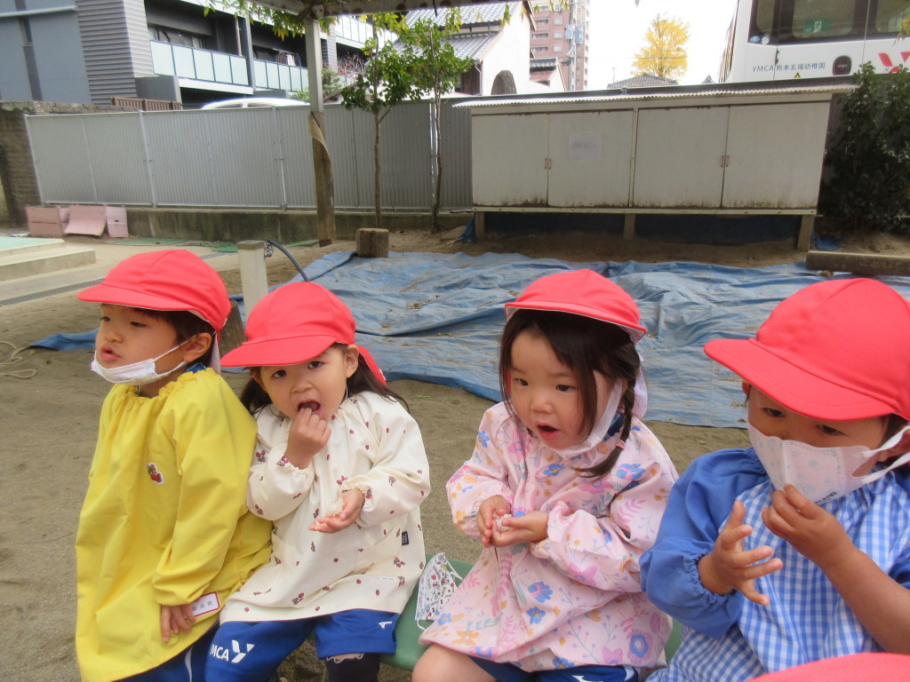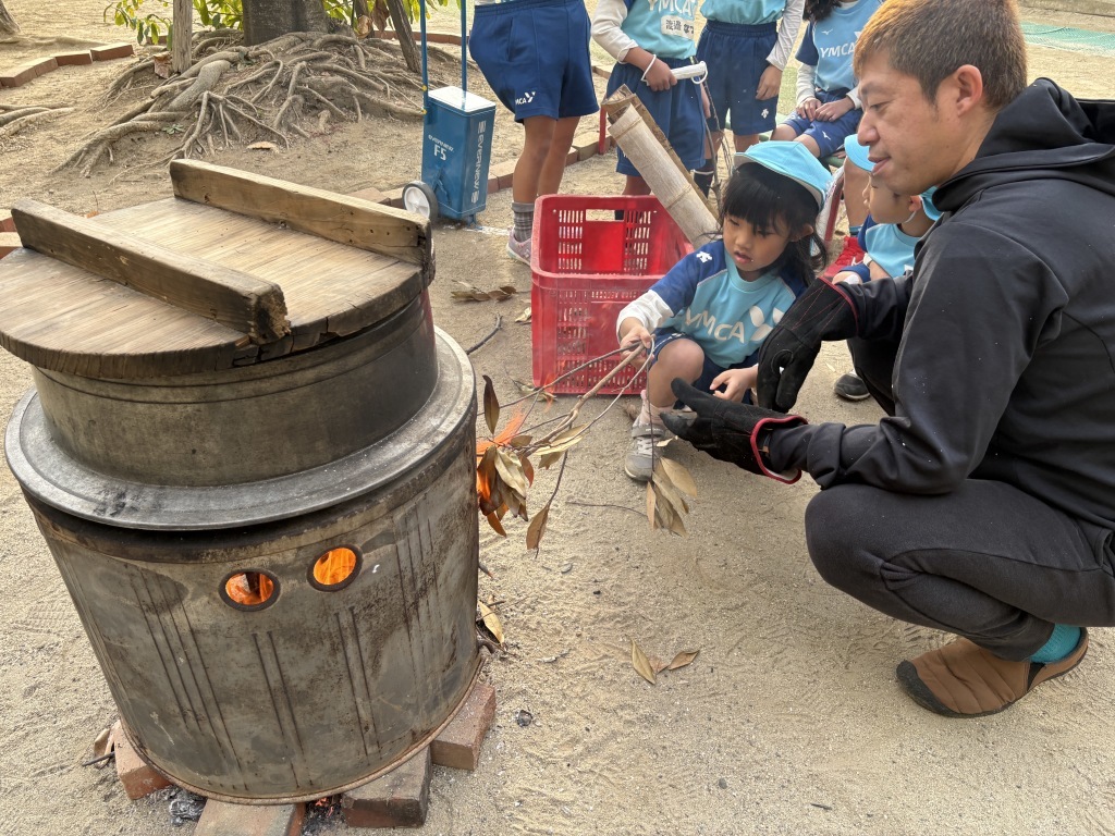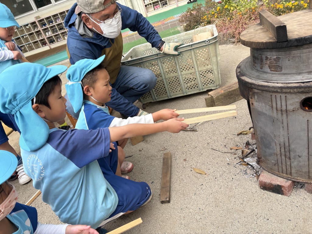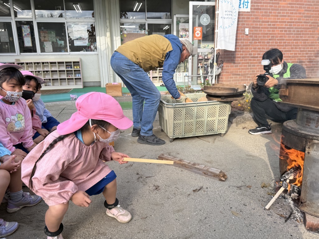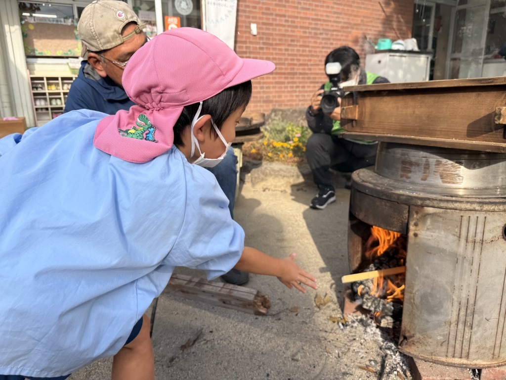 当日は朝から、釜戸のまわりにベンチを運んだり、焚き付け用の木材をかまどに入れたりと、年長児を中心に楽しみながらお手伝いをする子どもたちの姿が見られました。