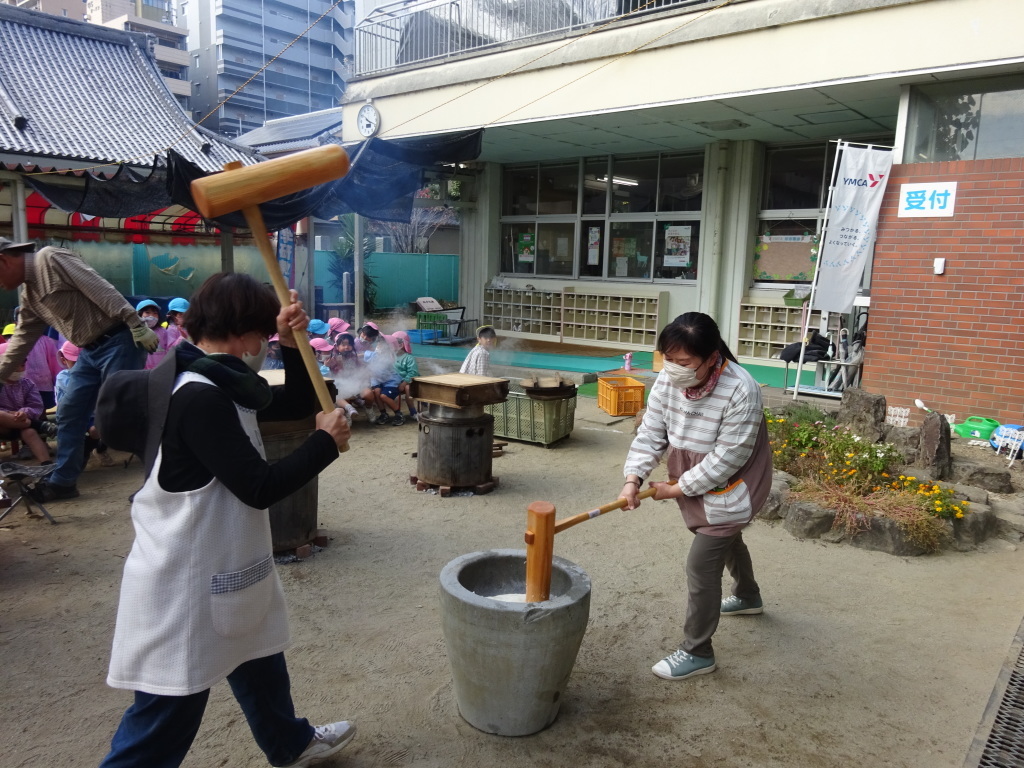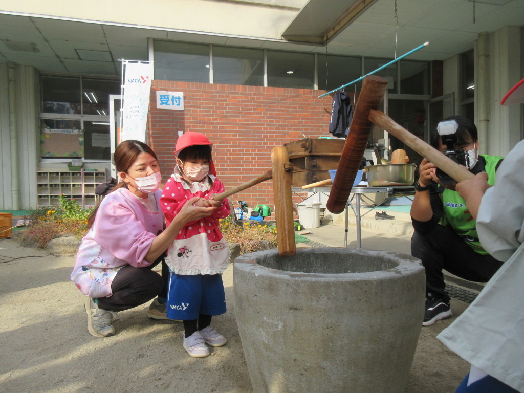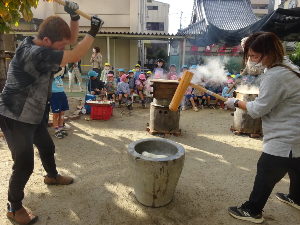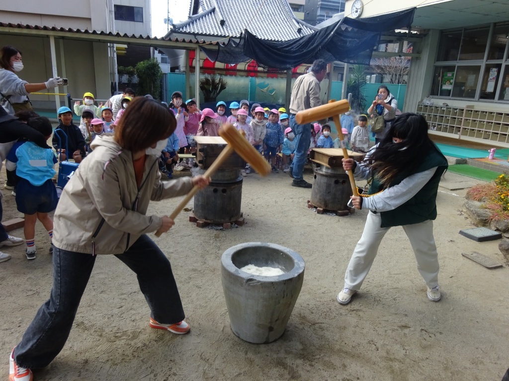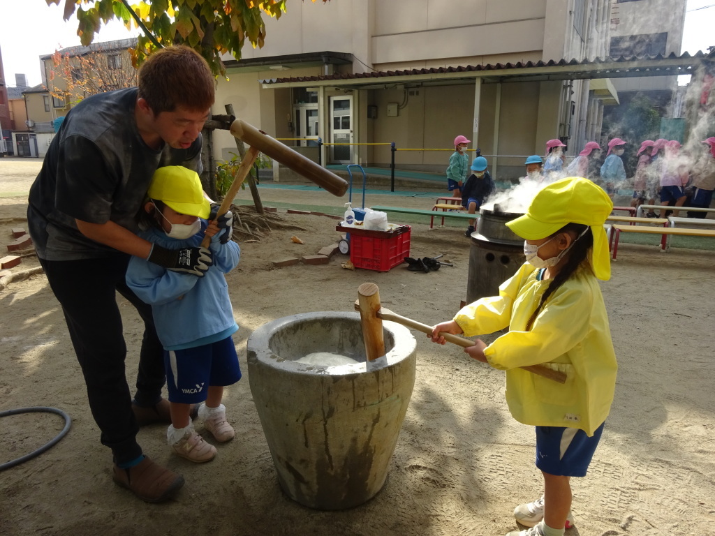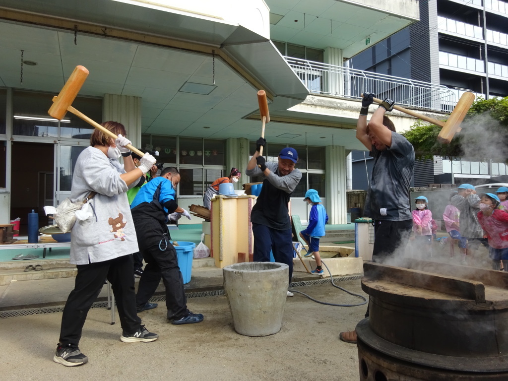 先生やお手伝いに来てくださった保護者の方、そして子どもたちみんなで「よいしょ!よいしょ!」と掛け声をかけながら、もち米がお餅に変わっていく様子を楽しみました。