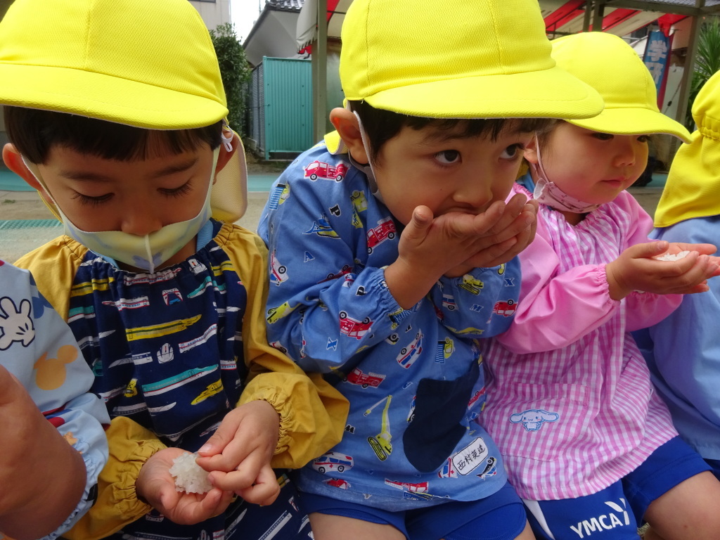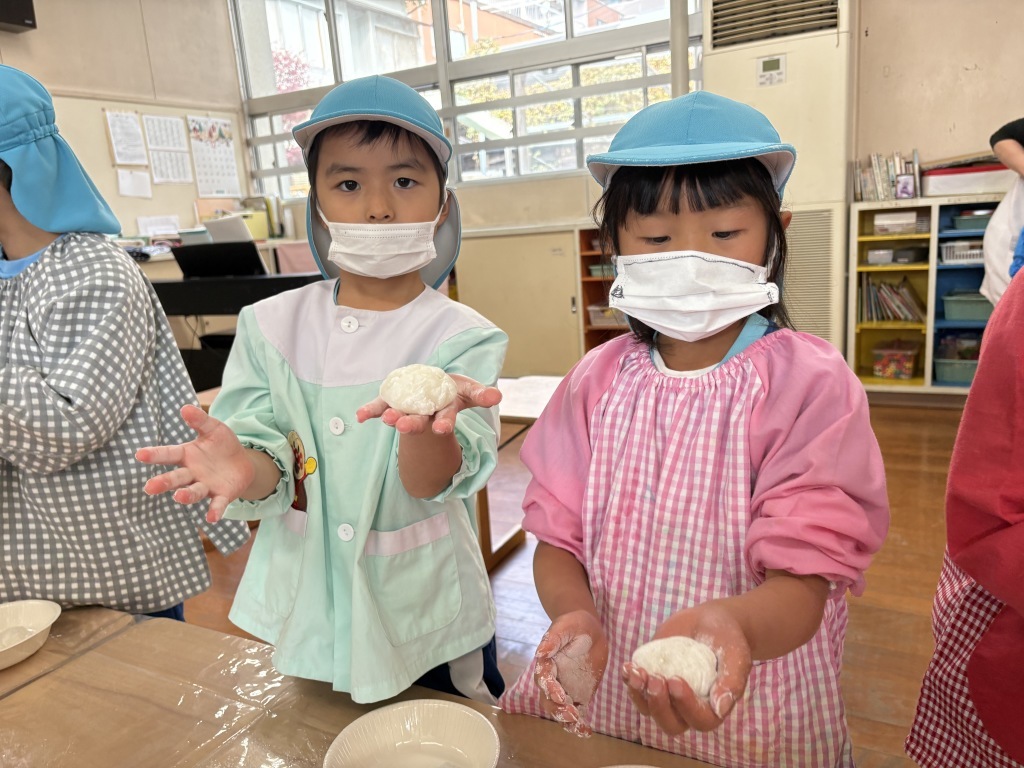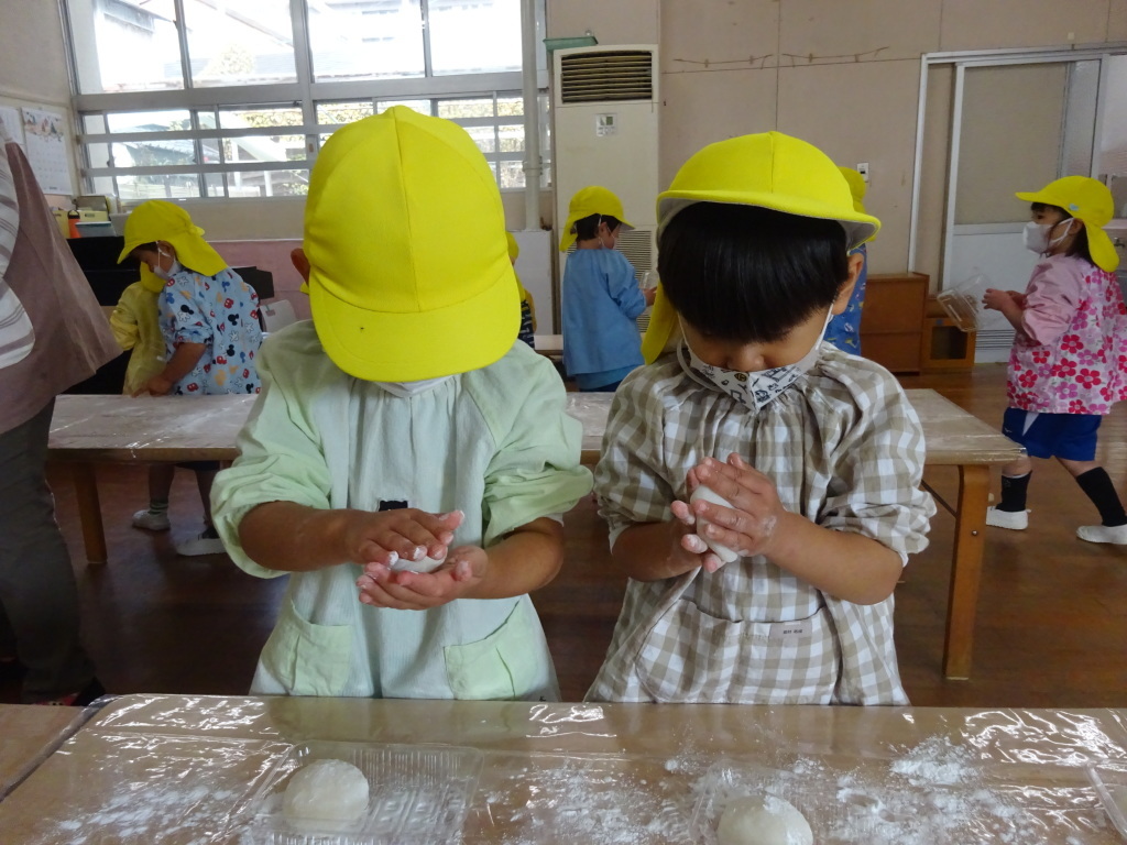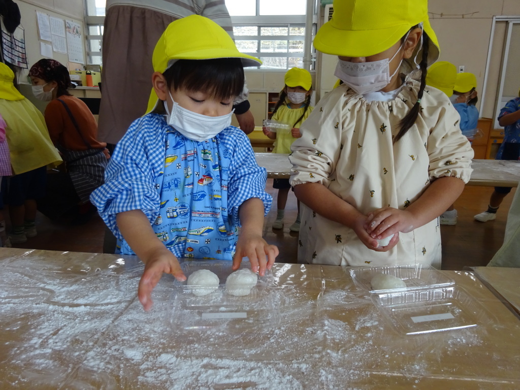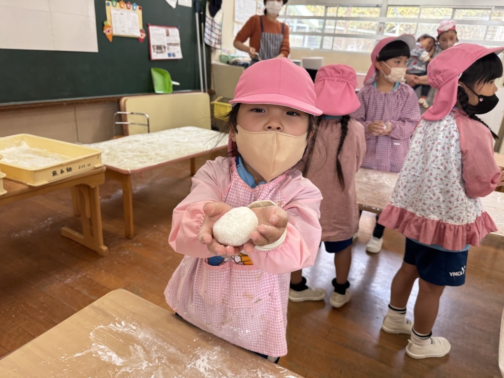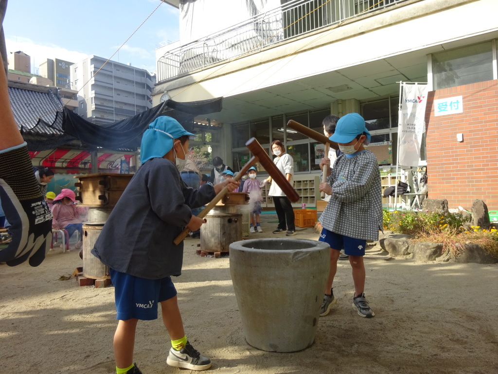 先生やお手伝いに来てくださった保護者の方、そして子どもたちみんなで「よいしょ!よいしょ!」と掛け声をかけながら、もち米がお餅に変わっていく様子を楽しみました。