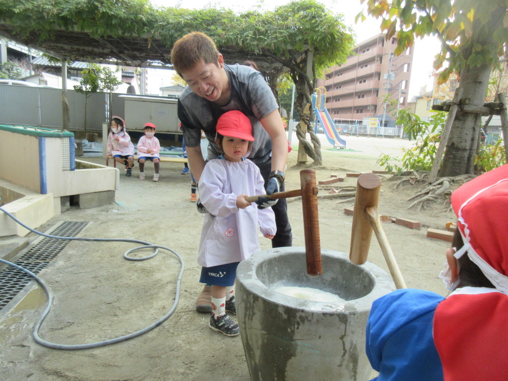 前日に年長組が、もち米を洗って水につけるところからお餅つきの準備をしてくれました。