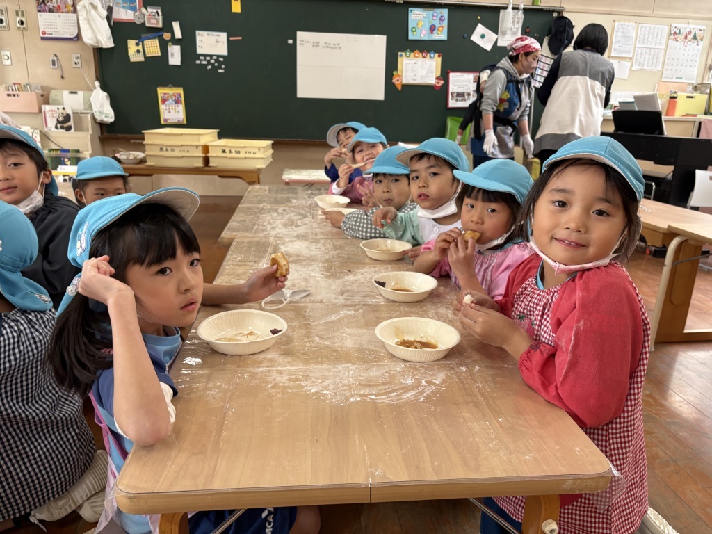 もち米が蒸し上がると、まずは炊きたてのもち米(おこわ)を一口ずつ味見。もち米の横で蒸していたさつま芋も食べて「どっちもおいしい!」『どっちももっと食べたい!」と嬉しそうな声が聞こえ、その後いよいよ餅つきがスタートしました。
