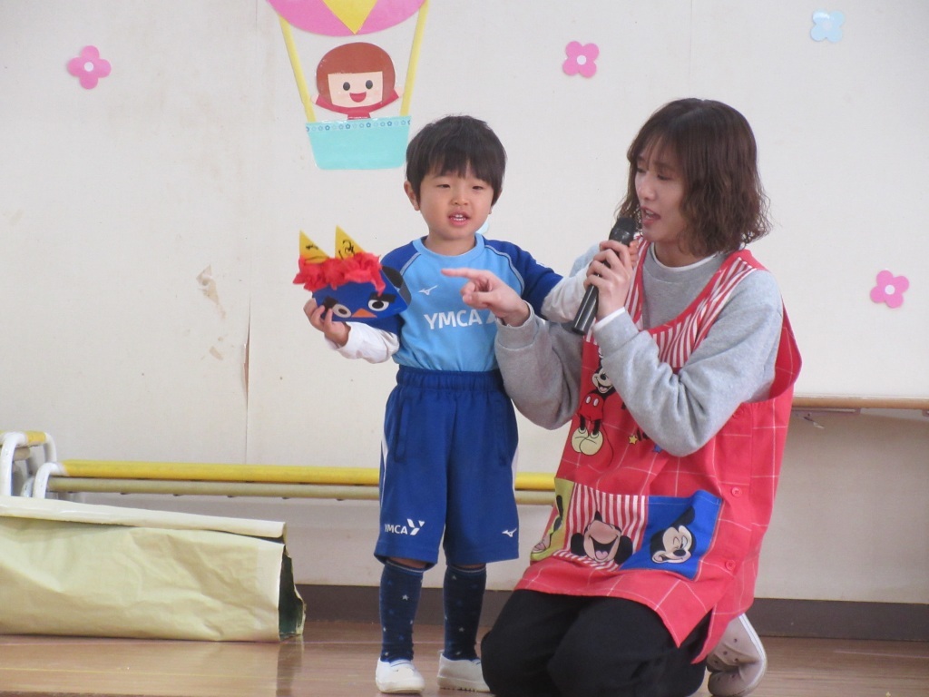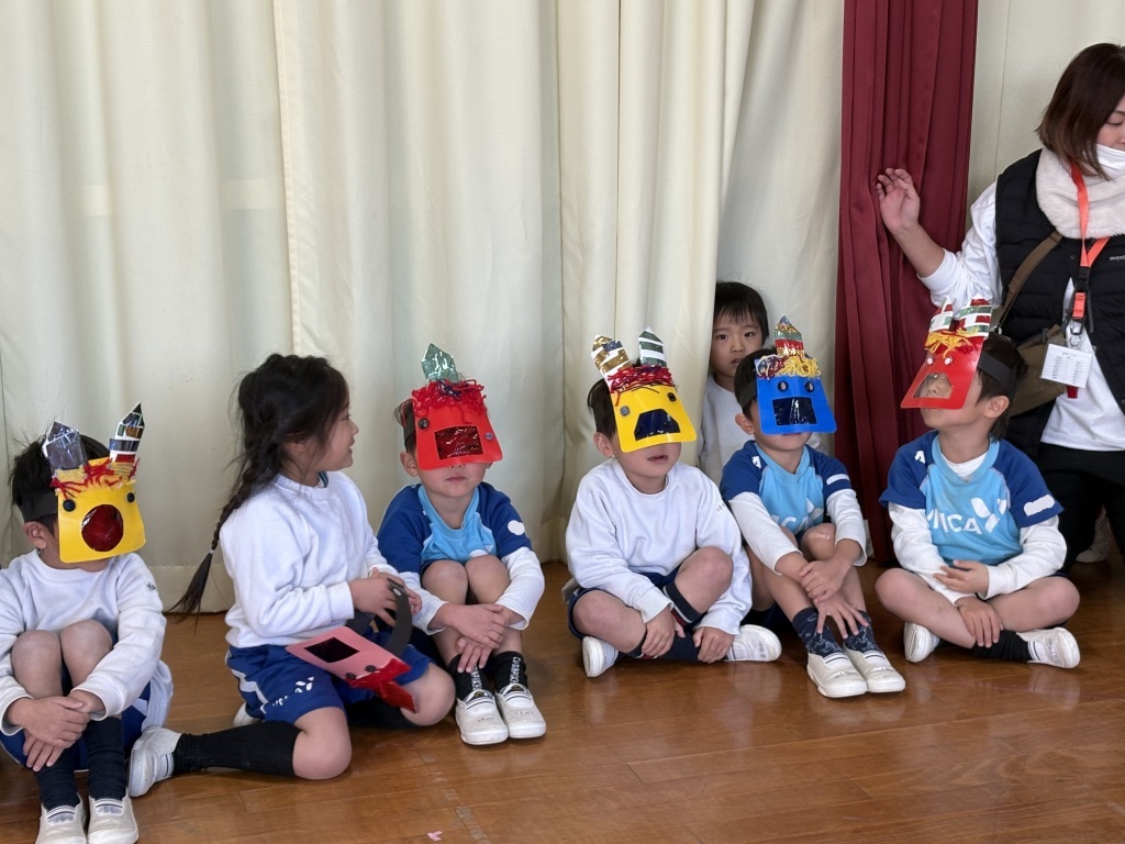 「節分ってなに?」「どうして豆をまくの?」「鬼が苦手なものは?」など、節分に関するお話をしました。子どもたちはしっかりと耳を傾けて聞いており、イワシの頭や柊の葉のことを知っているお友だちもいて、みんなの前で“柊イワシ”について教えてくれました。