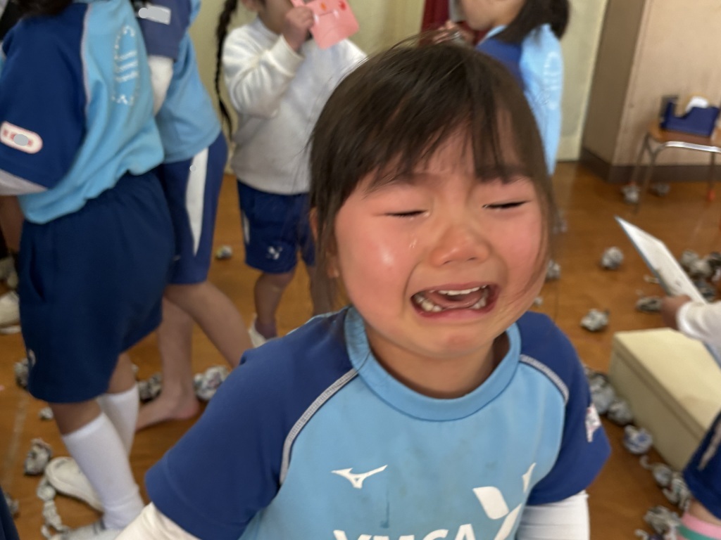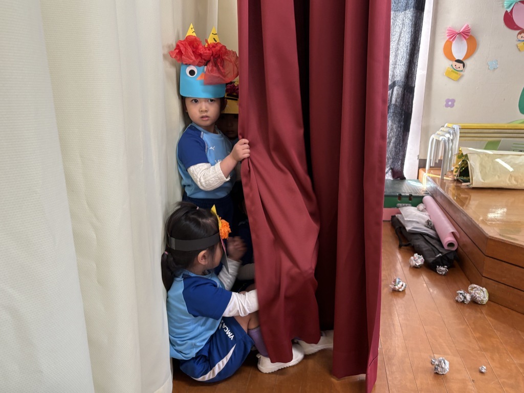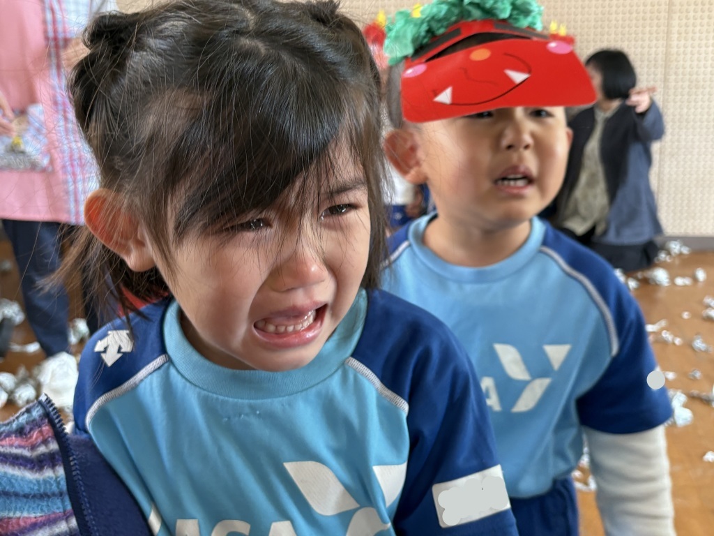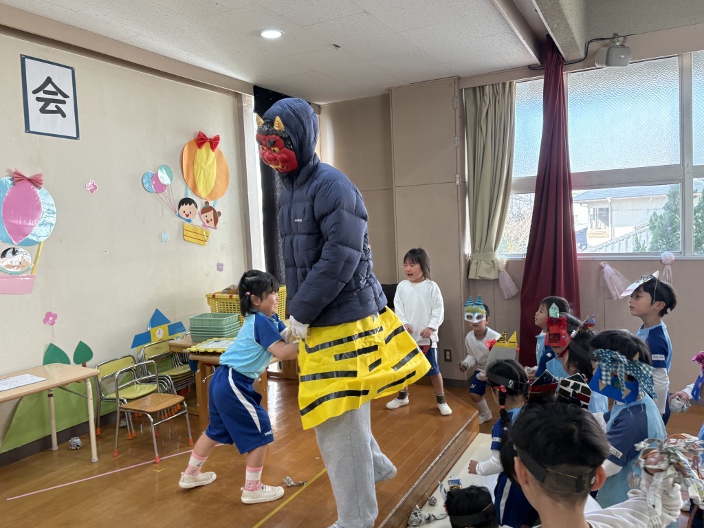 「キャー!」「イヤー!」「こわい……」と涙する姿もありましたが、みんなで力を合わせて新聞の豆をたくさん投げ、無事に鬼を追い払うことができました。途中、先生がさらわれそうになる場面もありましたが、子どもたちのおかげで助かりました。
