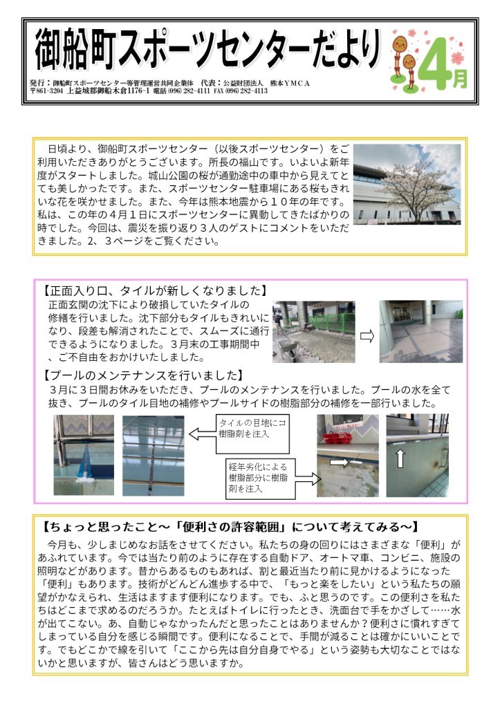 新学期がスタートしました。今年は、熊本に暮らすものとしては特別な時でもあります。とはいえ、過去を振り返りつつ、眼は、前を見つめる姿勢が大切だと感じます。御船町スポーツセンターだより4月号をお届けします。今月は、熊本地震から10年を振り返ることをテーマに3名の方に