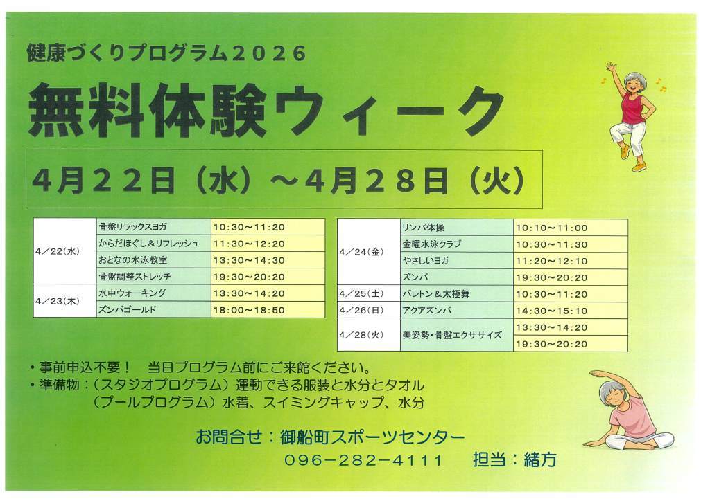 今年度も御船町スポーツセンター健康づくりプログラムが始まりました。新たに2つのプログラムが加わりました。どんなプログラムが行われているのか、皆さんに見ていただくため、無料体験ウィークを開催いたします。この期間に行われるプログラムは全て無料です。お気軽にご参加ください。