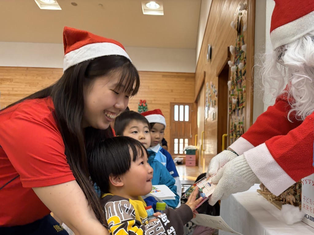 最後には、サンタクロースが登場し、子どもたちも大大大興奮でした。一番楽しみにしていたプレゼントをもらい、子どもたちはニコニコ笑顔いっぱいでした。さよならする時は、みんなで元気よく「メリークリスマス!!」