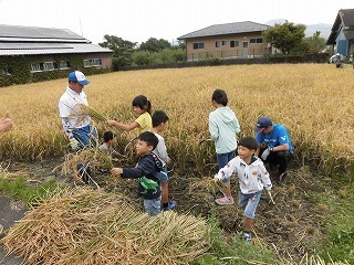 あっという間に稲が刈り取られていく様を子どもたちは興味津々に