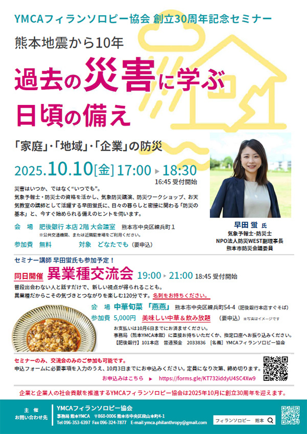 YMCAフィランソロピー協会 創立30周年記念防災セミナー&異業種交流会のご案内