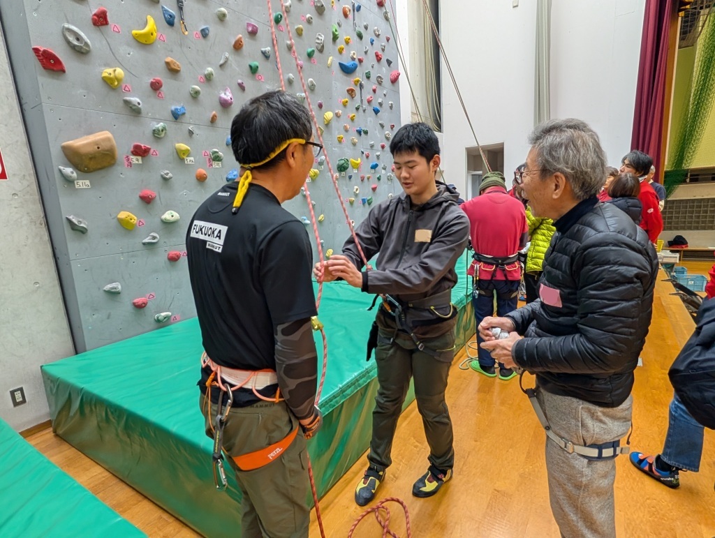 慣れないシューズやハーネスの装着にはじめは戸惑われましたが、ボランティアの方々の指導のもと、自分に合うサイズをしっかりと合わせ、ウォールを登っていただきました。