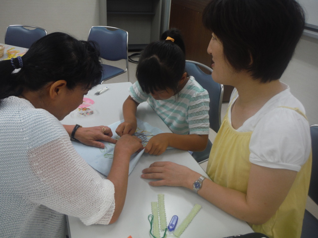 7月29日と8月5日の2日間で『親子刺しゅう教室』を行いました。 自分で書いた下絵に刺しゅう糸でステッチをし、スパンコールやビーズで 飾り付けまでを、親子で一緒に作りました。 n 難しいところは、お母さんとお祖母ちゃんに手伝っ…