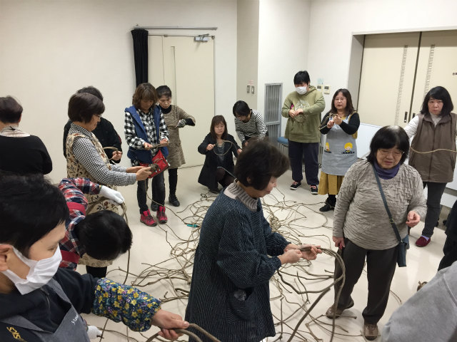 先日の土曜日、親子向けに実施した「クリスマスリース作り教室」。今日は、大人向けの事業として23名の方々にリース作りに挑戦していただきました。今回は大人向けなのでリース本体となるつるも大きめに巻いていきます。 途中あまりの静けさについつい…