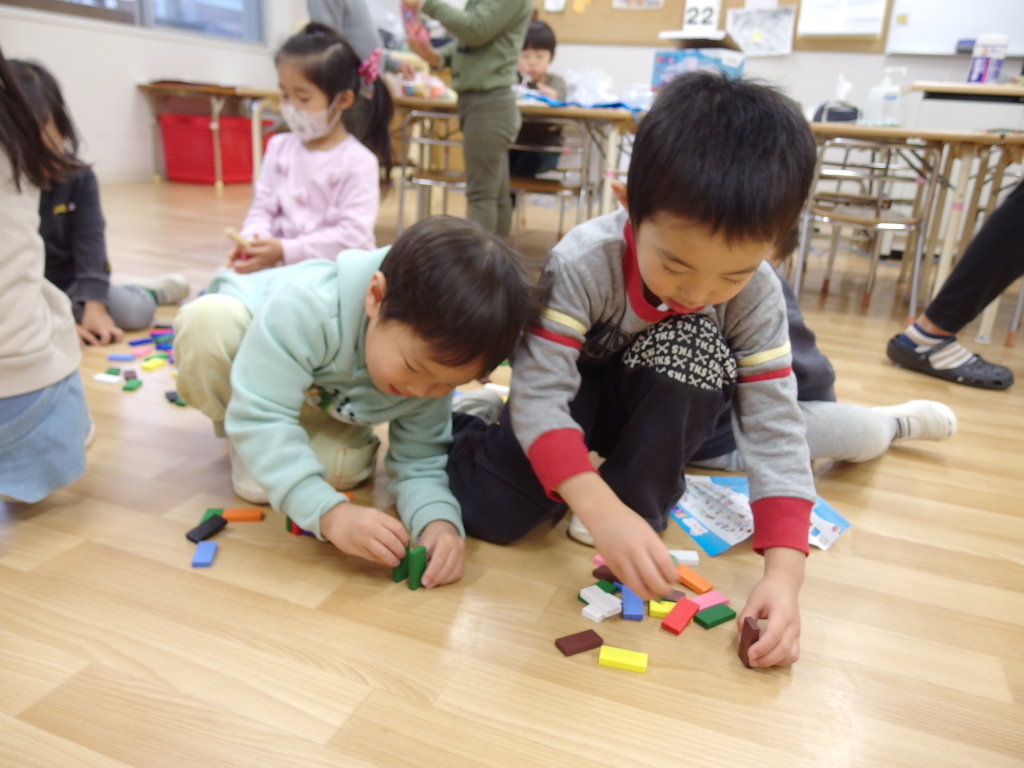 午後の預かり保育の中で早速披露。学年問わず、パズルや積み木が大好きな子どもたちは、思い思いにドミノを並べたり、積み重ねたりと様々なやり方で遊んでいました。