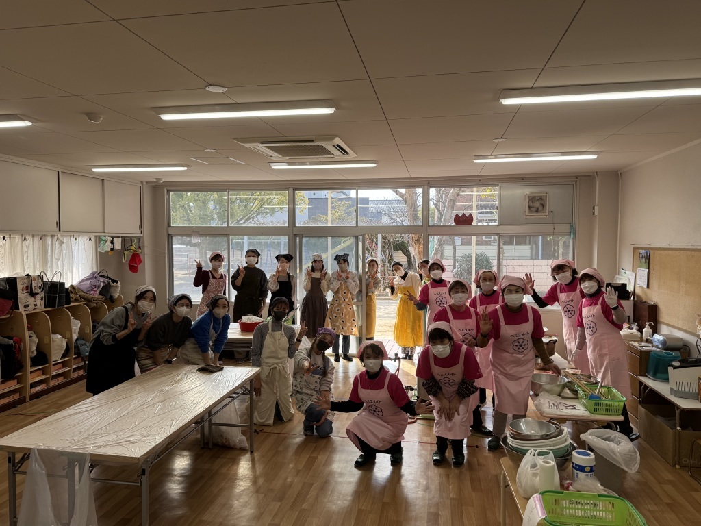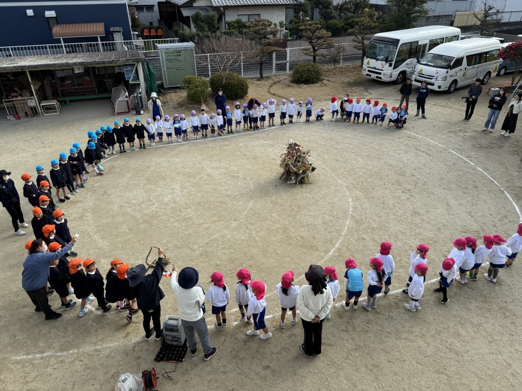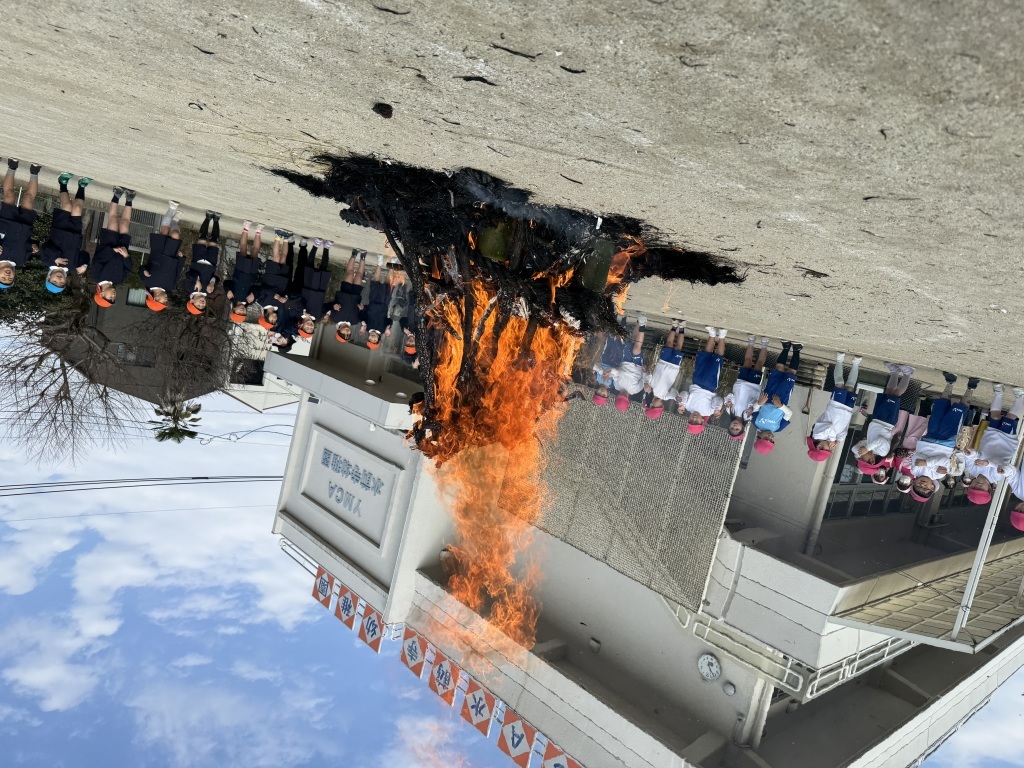 水前寺幼稚園でどんどやを行いました。各家庭から持ち寄ったしめ縄や飾りを櫓に設置し、火を入れると勢いよく燃え上がりました。無病息災を願って子どもたちも体に煙をかけていました。どんどやが終わった後は、食生活改善推進委員の皆さまと保護者会(おひさま会)の皆さまが拵えてくださった豚汁をいただきました。あったかくてとっても美味しかったね!ご協力いただいた皆様ありがとうございました。