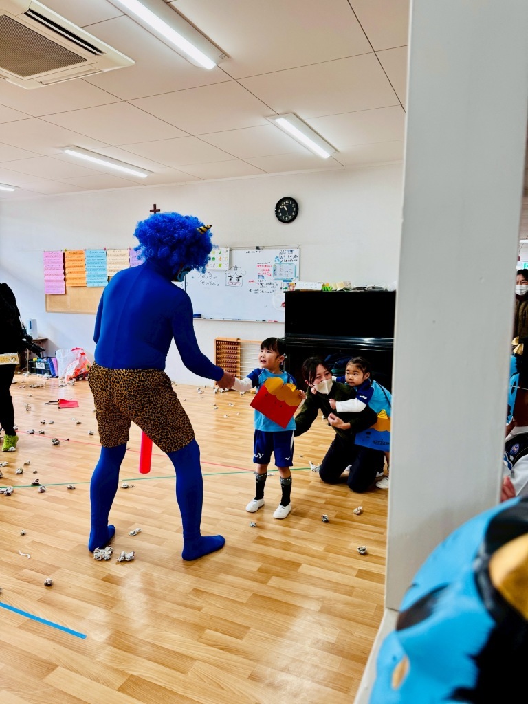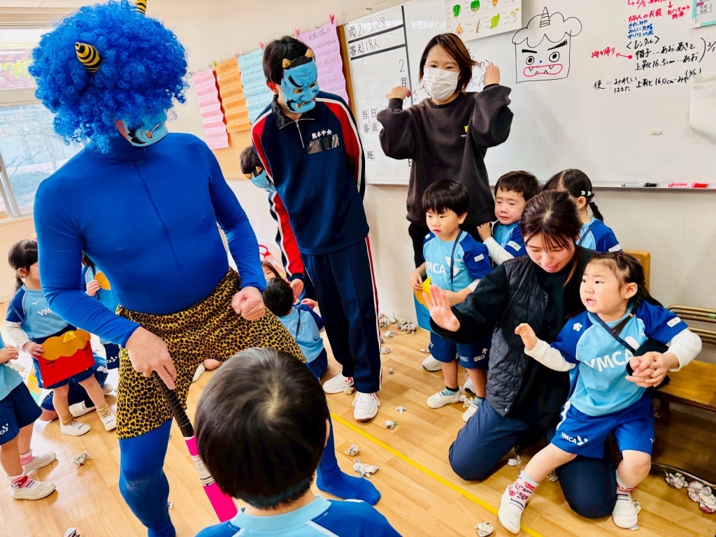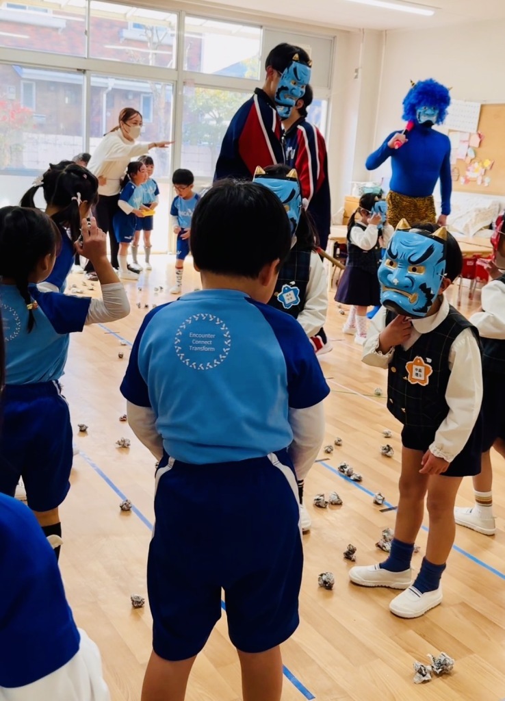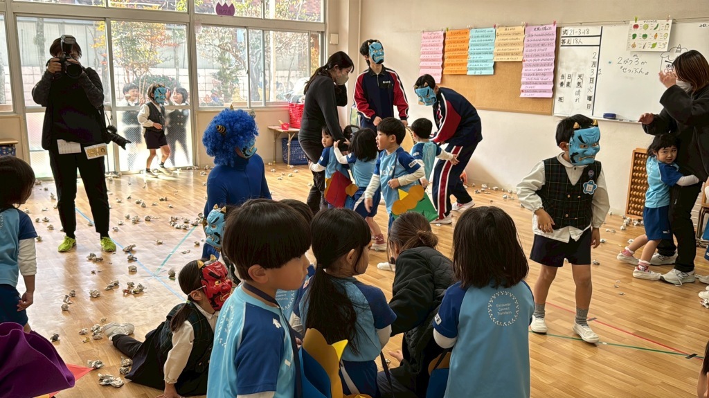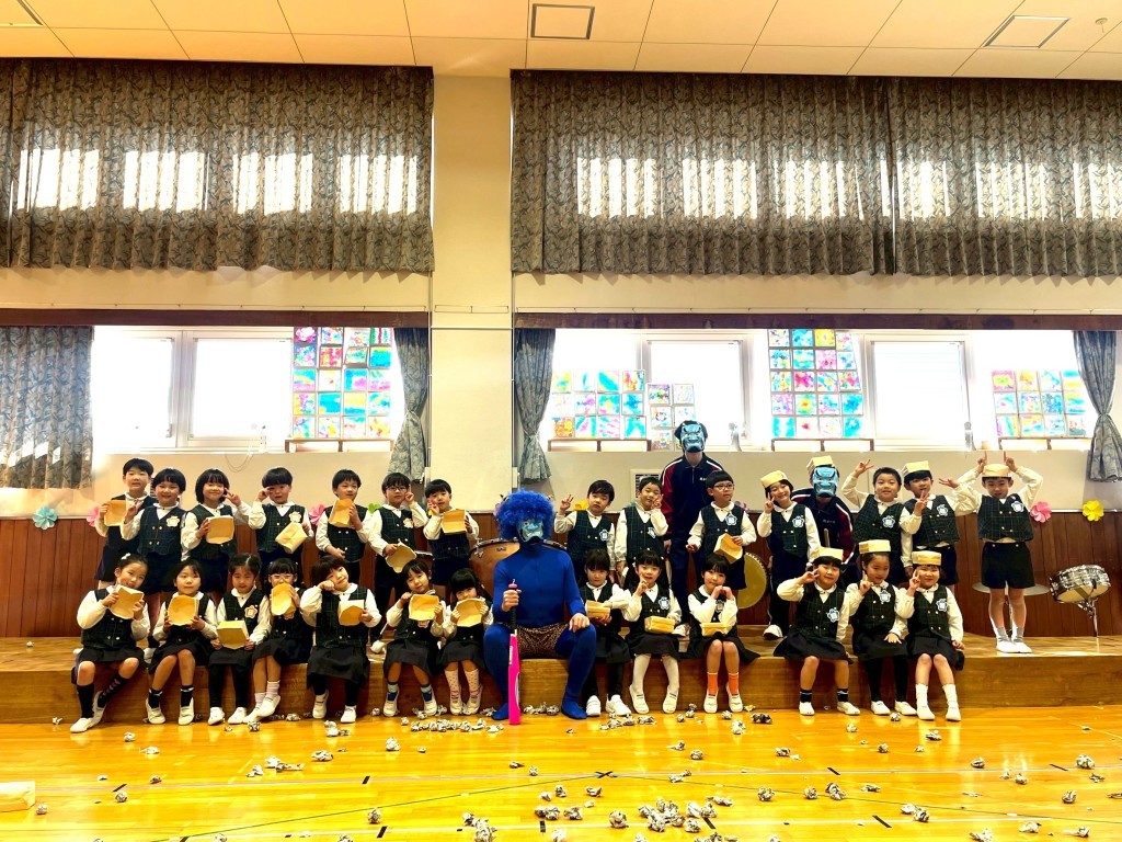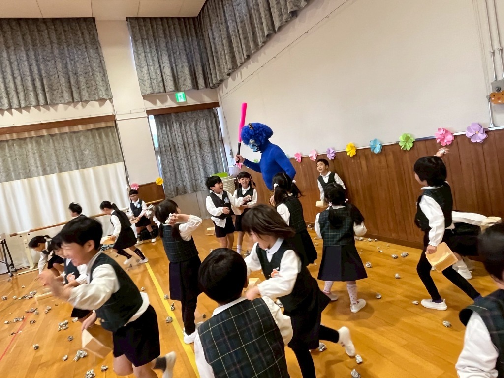 今日は節分!豆まきをして無病息災を願いました。子どもたちは、突然現れた鬼に一瞬逃げ惑いましたが、勇気を振り絞って豆を投げつけていました。鬼さんも子どもたちの勇気に降参!参った、参った!鬼さんと仲直りの握手。鬼も内!福も内!優しい園児たちでした。