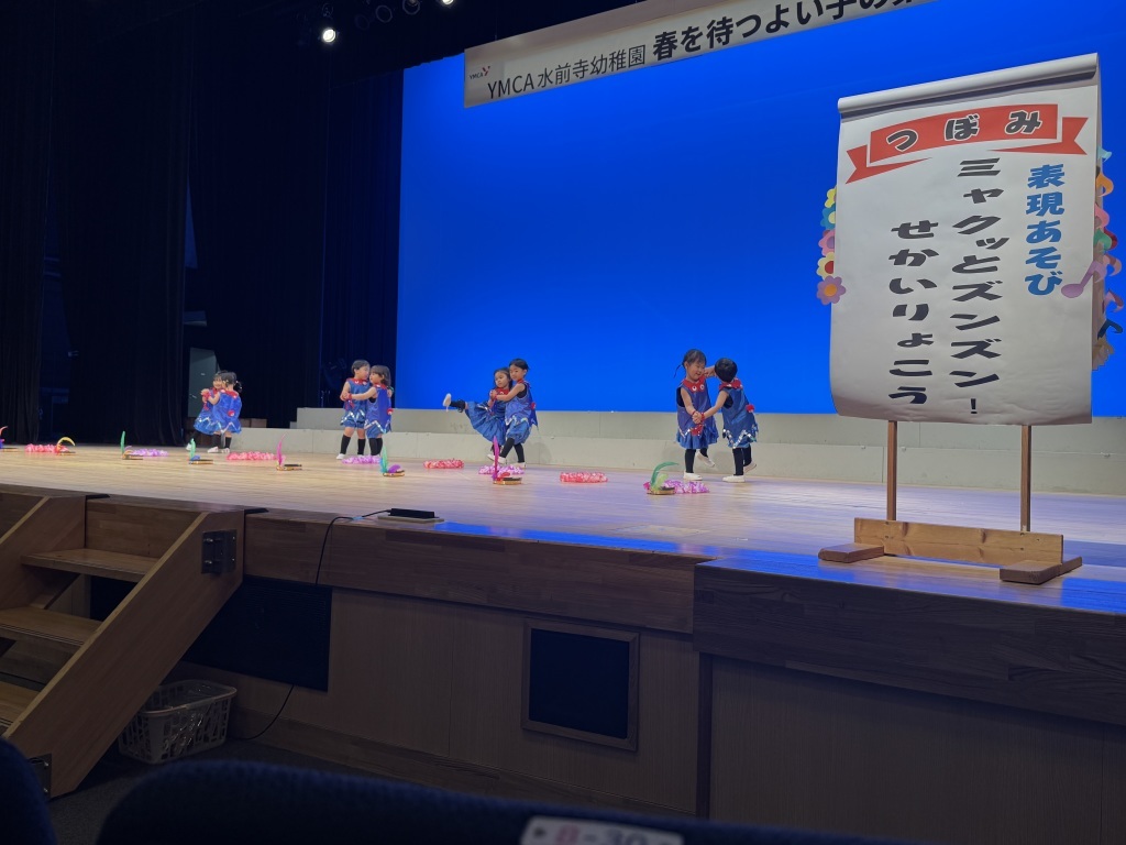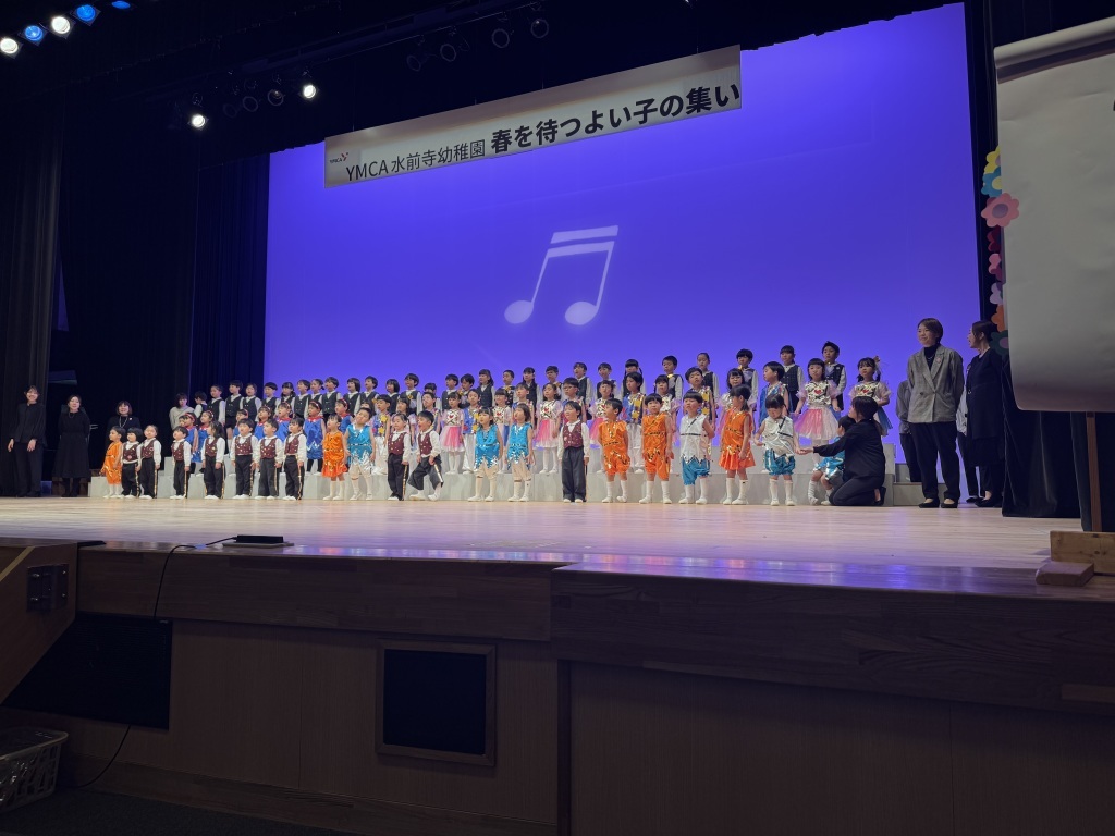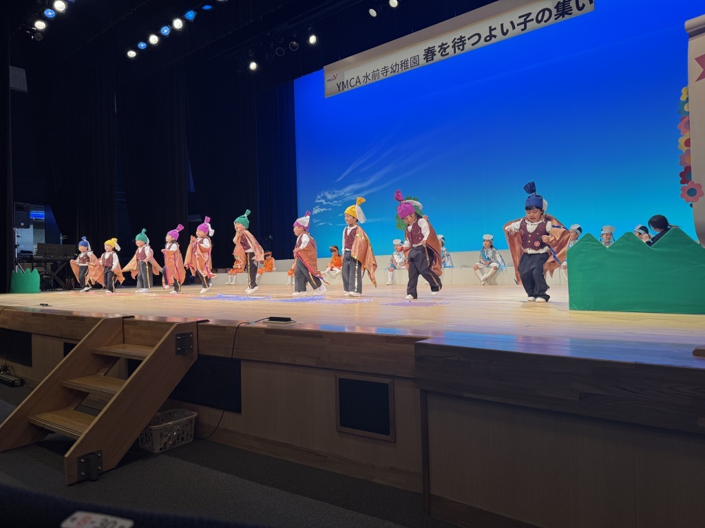 今日はYMCA水前寺幼稚園の発表会!「春を待つよいこの集い」でした。4月にスタートしたクラスもまとめの時期に入っています。これまで保護者の皆様、先生方、地域の皆さんの愛情の中で成長することが出来ました。心より感謝いたします。今年度全体で行う発表は最後になります。楽しみにしていたこどもたち、心をドキドキさせながら今日の日を迎えた子ども、力を出し切った子どもたち、緊張で力を出せなかった子どもたちなどのすべてが子どもたちの成長に大切なものになったようでした。今年度も残すところ1か月、年長さんは卒園式まで2週間です。楽しい思い出をいっぱい作っていきましょうね!